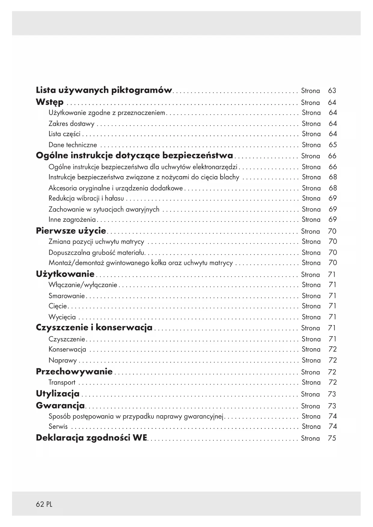 OSTRZEŻENIE! u Jeśli kabel przyłączeniowy wymaga wymiany, należy zlecić to producentowi lub jego przedstawicielowi, aby uniknąć zagrożeń bezpieczeństwa. Naprawy Wewnątrz tego produktu nie ma części, które może naprawiać użytkownik. W celu sprawdzenia i naprawy produktu należy kontaktować się z wykwalifikowanym technikiem. Przechowywanie Wyczyścić produkt (patrz „Czyszczenie”). Przechowywać produkt i jego akcesoria w ciemnym, suchym, wolnym od mrozu miejscu o dobrej wentylacji. Produkt przechowywać w miejscu niedostępnym dla dzieci. Transport Chronić produkt przed uderzeniami i silnymi wstrząsami, które występują szczególnie podczas transportu w pojazdach. Zabezpieczać produkt przed ześlizgnięciem się i przechyleniem.73PL Utylizacja Opakowanie wykonane jest z materiałów przyjaznych dla środowiska, które można przekazać do utylizacji w lokalnym punkcie przetwarzania surowców wtórnych. Przy segregowaniu odpadów prosimy zwrócić uwagę na oznakowanie materiałów opakowaniowych, oznaczone są one skrótami (a) i numerami (b) o następującym znaczeniu: 1–7: Tworzywa sztuczne / 20–22: Papier i tektura / 80–98: Materiały kompozytowe. Produkt: Produkt, w tym akcesoriai materiały opakowaniowe, nadają się do recyklingu ipodlegają rozszerzonej odpowiedzialności producenta. Wyrzuć je osobno, zgodnie z ilustracją przedstawiającą informacje o sortowaniu, aby zapewnić lepszą utylizację odpadów. Logo Triman jest ważne tylko dla Francji. Informacji na temat możliwości utylizacji wyeksploatowanego produktu udziela urząd gminy lub miasta. Z uwagi na ochronę środowiska nie wyrzucać urządzenia po zakończeniu eksploatacji do odpadów domowych, lecz prawidłowo zutylizować. Informacji o punktach zbiorczych i ich godzinach otwarcia udziela odpowiedni urząd. Gwarancja Produkt wyprodukowano zgodnie z wysokimi standardami jakości i przed wysyłką poddano skrupulatnej kontroli. W przypadku wad materiałowych lub produkcyjnych nabywcy przysługuje ustawowe prawo do dochodzenia swoich roszczeń u sprzedawcy produktu. Niniejsza gwarancja w żaden sposób nie ogranicza ustawowych praw nabywcy produktu. Produkt jest objęty 3‑letnią gwarancją liczoną od daty zakupu. Okres gwarancyjny rozpoczyna się z datą zakupu. Ponieważ jest to dokument wymagany jako dowód zakupu, oryginał paragonu kasowego należy przechowywać w bezpiecznym miejscu. Jakiekolwiek usterki lub uszkodzenia występujące w produkcie już w chwili zakupu należy zgłosić niezwłocznie po rozpakowaniu produktu. W przypadku wystąpienia wad materiałowych lub wykonawczych w okresie 3 lat od daty zakupu, producent dokonuje – według własnej oceny – bezpłatnej naprawy lub wymiany produktu. Okres gwarancyjny nie ulega przedłużeniu wskutek uznania roszczenia z tytułu gwarancji. Dotyczy to także części wymienionych lub poddanych naprawie. Jeśli produkt zostanie uszkodzony lub będzie używany lub serwisowany w niewłaściwy sposób, niniejsza gwarancja zostaje unieważniona. Świadczenie gwarancyjne obejmuje wady materiałowe i fabryczne. Niniejsza gwarancja nie obejmuje części produktu ulegających normalnemu zużyciu, uznawanych za części eksploatacyjne (np. baterie, baterie akumulatorowe, węże, wkłady) ani uszkodzeń części delikatnych, np. przełączników lub elementów szklanych. Zgodnie z Kodeksem Cywilnym art. 581 §1 wraz z wymianą urządzenia lub ważnej części czas gwarancji rozpoczyna się na nowo.74 PL Sposób postępowania w przypadku naprawy gwarancyjnej Aby zapewnić szybkie rozpatrzenie Państwa roszczenia, prosimy stosować się do następujących wskazówek: Przygotować numer artykułu (IAN409144_2207) oraz paragon jako dowódzakupu. Numer artykułu znaleźć można na tabliczce znamionowej, jako napis wygrawerowany na produkcie, na stronie tytułowej instrukcji obsługi (na dole po lewej stronie) lub na naklejce z tyłu lub na spodzie produktu. W razie wystąpienia błędów w działaniu lub innych wad, należy skontaktować się z podanym niżej działem serwisowym telefonicznie lub pocztą elektroniczną. Po zarejestrowaniu produktu jako uszkodzony można go bezpłatnie zwrócić na adres serwisu, który zostanie Państwu podany. Należy pamiętać o dołączeniu dowodu zakupu (paragonu kasowego) oraz krótkiego, pisemnego opisu usterki wraz z informacją o tym, kiedy do niej doszło. Serwis Serwis Polska Tel.: 008004911946 E‑Mail: owim@lidl.pl75PL Deklaracja zgodności WE76 CZ Seznam použitých piktogramů ................................... Strana 77 Úvod.................................................................. Strana 78 Použití ke stanovenému účelu.............................................. Strana 78 Rozsah dodávky........................................................ Strana 78 Seznam dílů ........................................................... Strana 78 Technické údaje . . . . . . . . . . . . . . . . . . . . . . . . . . . . . . . . . . . . . . . . . . . . . . . . . . . . . . . . Strana 79 Všeobecné bezpečnostní pokyny ................................ Strana 80 Všeobecné bezpečnostní pokyny pro elektrické nástroje......................... Strana 80 Bezpečnostní pokyny pro řezačku plechu .................................... Strana 82 Originální příslušenství/přídavné přístroje .................................... Strana 82 Snížení vibrací a hluku ................................................... Strana 83 Chování vnouzových případech ........................................... Strana 83 Zbytková rizika......................................................... Strana 83 První použití......................................................... Strana 84 Změňte polohu držáku matrice ............................................ Strana 84 Přípustná tloušťka materiálu ............................................... Strana 84 Montáž/demontáž drá