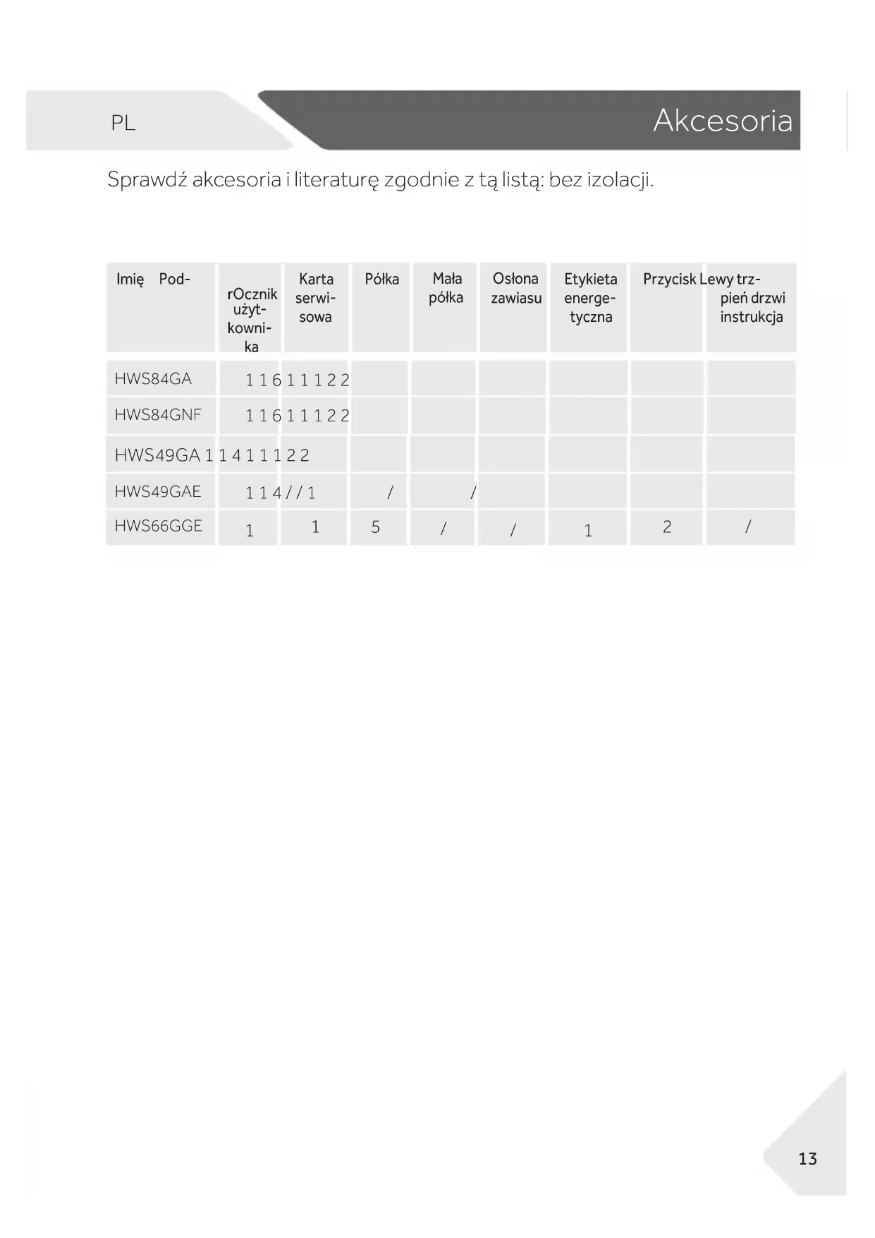 | Nazwa/identifikator modelu | HWS49GA /HWS49GAE | HWS84GNF | HWS84GA /HWS66GGE |
