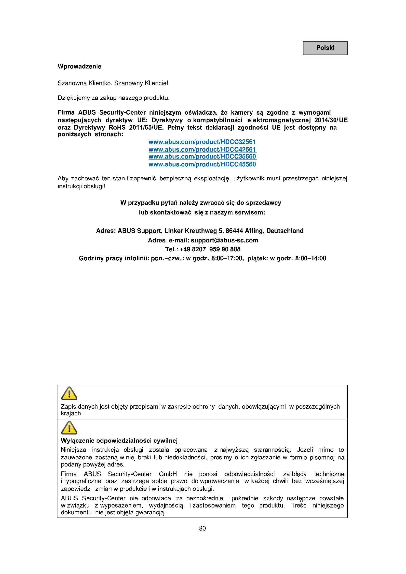 MAIN MENU (menu główne) Ogólna nawigacja po menu BACK O jeden krok menu wstecz EXIT Zamknięcie menu głównego bez zapisywania zmian EXIT & SAVE Zamknięcie menu głównego i zapisanie wszystkich zmian VIDEO FORMAT Wybór formatu wideo HDCC32561/HDCC42561: o 2 Mpx przy 25 lub 30 klatkach na sekundę HDCC35560/HDCC45560: o 2 Mpx przy 25 lub 30 klatkach na sekundę o 4 Mpx przy 25 lub 30 klatkach na sekundę o 5 Mpx przy 20 klatkach na sekundę91 Polski EXPOSURE (ustawienia naświetlenia) EXPOSURE MODE Tryb ustawień naświetlenia GLOBAL Automatycznie BLC Kompensacja oświetlenia konturowego HLC Kompensacja rozjaśnienia WDR Wide Dynamic Range – szeroki zakres dynamiki AGC Automatyczna regulacja wzmocnienia. OFF Wył. LOW Niska MIDDLE Średnia HIGH Wysoka SLOW Shutter Czas migawki OFF Standardowy czas migawki ×2 do ×16 Wydłużony czas migawki DAY NIGHT (ustawienia dzień/noc) MODE Ustawianie trybu AUTO Automatycznie COLOR Obraz zawsze w kolorze BW Obraz zawsze czarno-biały IR LIGHT Włączanie i wyłączanie światła podczerwonego SMART IR Ustawianie trybu Smart IR MODE 1 Do wewnątrz / na zewnątrz MODE 2 Do wewnątrz MODE 3 Na zewnątrz LEVEL Wybór poziomu IR D->N THRESHOLD Wartości progowa z dnia na noc Im niższa wartość, tym wcześniej przełącza się tryb dzień/noc. Im wyższa wartość, tym wcześniej przełącza się tryb dzień/noc. N->D THRESHOLD Wartość progowa z nocy na dzień (patrz wyżej)92 Polski VIDEO SETTING (ustawienia wideo) IMAGE MODE Wybór trybu obrazu STD Ustawienie domyślne HIGH-SAT Wysokie nasycenie WHITE BALANCE Otwieranie ustawień kompensacji bieli BRIGHTNESS Ustawianie jasności CONTRAST Ustawianie kontrastu SHARPNESS Ustawianie ostrości SATURATION Ustawianie nasycenia 3DNR Ustawianie dynamicznej redukcji szumów MIRROR Odbicie lustrzane obrazu z kamery DEFAULT Normalnie H Poziomo V Pionowo HV Poziomo i pionowo WB (ustawienia kompensacji bieli) MODE Ustawianie trybu ATW Automatycznie MANUAL Ustawienie ręczne RGAIN Ustawianie wzmocnienia czerwieni BGAIN Ustawianie wzmocnienia błękitu FUNCTIONS (ustawienia funkcji) – tylko dla HDCC35560/HDCC45560 MOTION DET Otwieranie funkcji wykrywania ruchu PRIVACY Otwieranie maskowania stref prywatności PRIVACY/MOTION (otwieranie maskowania stref prywatności / wykrywania ruchu) MODE Włączanie/wyłączanie maskowania stref prywatności / wykrywania ruchu AREA x Edycja strefy DISPLAY Włączanie/wyłączanie wyświetlacza X POSITION Ustawianie pozycji osi X Y POSITION Ustawianie pozycji osi Y WIDTH Ustawianie szerokości HEIGHT Ustawianie wysokości RETURN Zamknięcie menu SENSITIVITY Ustawianie czułości COLOR Ustawianie koloru TRANSPARENCY Włączanie/wyłączanie przezroczystości RETURN Zamknięcie punktu menu FACTORY DEFAULT Przywrócenie ustawień fabrycznych kamery93 Español Introducción Estimado cliente: Le agradecemos la compra de este producto. Por la presente, ABUS Security-Center declara que las cámaras cumplen las exigencias de las siguientes directivas de la UE: Directiva de compatibilidad electromagnética 2014/30/UE y Directiva RoHS 2011/65/UE. El texto íntegro de la declaración de conformidad UE está disponible en las siguientes direcciones de Internet: www.abus.com/product/HDCC32561 www.abus.com/product/HDCC42561 www.abus.com/product/HDCC35560 www.abus.com/product/HDCC45560 Para conservar este estado y garantizar un funcionamiento exento de peligros, debe tener en cuenta lo expuesto en este manual de instrucciones. Si tiene alguna pregunta, diríjase a su distribuidor especializado o póngase en contacto con nuestro servicio de atención al cliente: Correo postal: ABUS Support, Linker Kreuthweg 5, 86444 Affing, Alemania E-mail: support@abus-sc.com Tel.: +49 8207 959 90 888 Horario de atención telefónica: Lu-Ju: 08 - 17 h; Vi: 08 – 14 h
