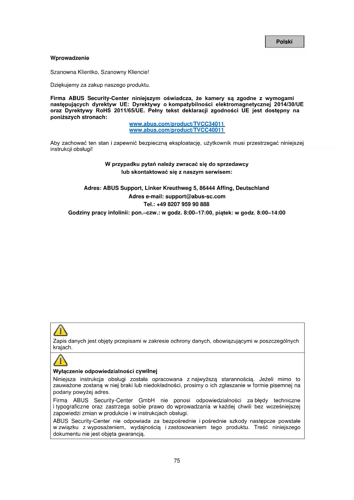 - RETURN Esce dal menu SENSITIVITY Imposta la sensibilità COLOR Imposta il colore TRANSPARENCY Attiva/disattiva la trasparenza RETURN Voce del menu per uscire FACTORY DEFAULT Imposta la telecamera sulle impostazioni di fabbrica75 Polski Wprowadzenie Szanowna Klientko, Szanowny Kliencie! Dziękujemy za zakup naszego produktu. Firma ABUS Security-Center niniejszym oświadcza, że kamery są zgodne z wymogami następujących dyrektyw UE: Dyrektywy o kompatybilności elektromagnetycznej 2014/30/UE oraz Dyrektywy RoHS 2011/65/UE. Pełny tekst deklaracji zgodności UE jest dostępny na poniższych stronach: www.abus.com/product/TVCC34011 www.abus.com/product/TVCC40011 Aby zachować ten stan i zapewnić bezpieczną eksploatację, użytkownik musi przestrzegać niniejszej instrukcji obsługi! W przypadku pytań należy zwracać się do sprzedawcy lub skontaktować się z naszym serwisem: Adres: ABUS Support, Linker Kreuthweg 5, 86444 Affing, Deutschland Adres e-mail: support@abus-sc.com Tel.: +49 8207 959 90 888 Godziny pracy infolinii: pon.–czw.: w godz. 8:00–17:00, piątek: w godz. 8:00–14:00