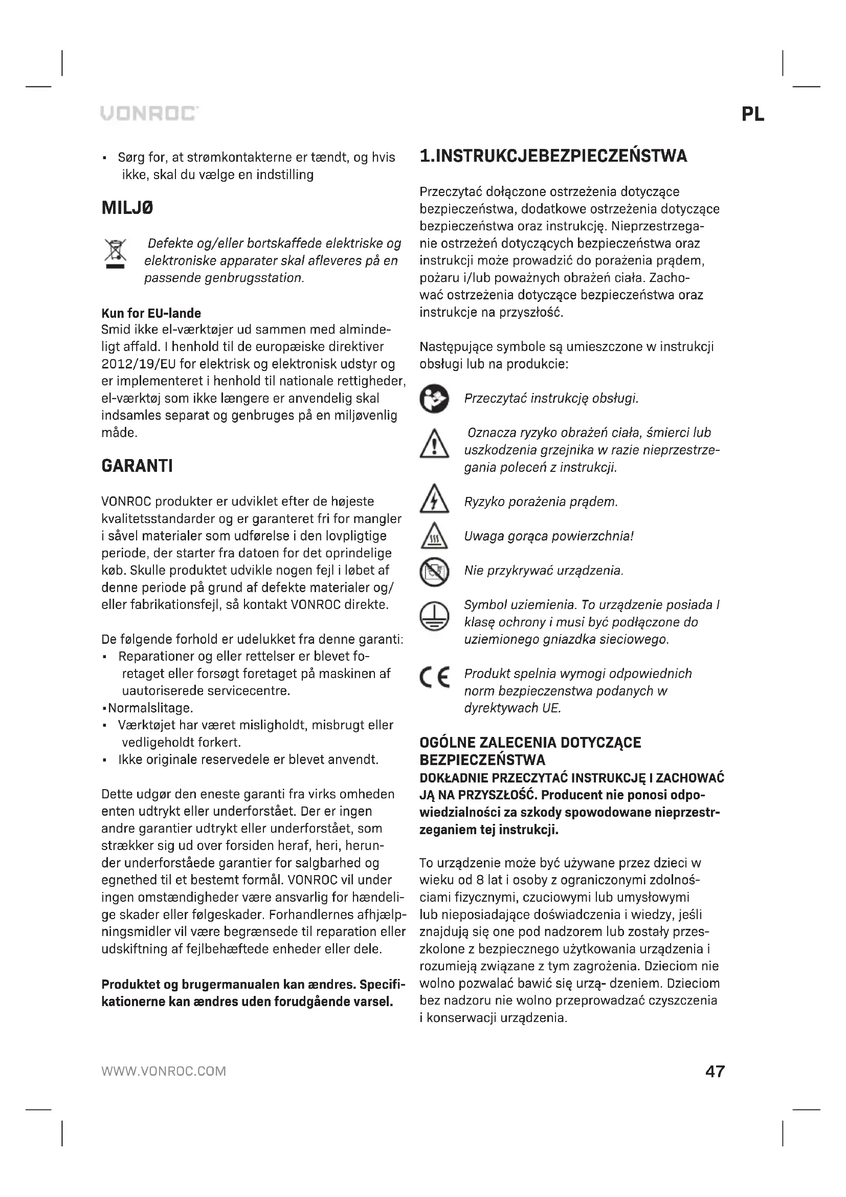 - Sprawdzić, czy włączniki zasilania są ustawione w położenie włączenia. Jeśli nie, ustawić je odpowiednio. SRODOWISKO Uszkodzone i/lub niepotrzebne urzadzenia elektryczne lub elektroniczne podlegaja zbiórce w odpowiednich punktach recyklingu. Tylko kraje WE Nie wyrzucac elektronarzedzi wraz z odpadami z gospodarstw domowych. Zgodnie z dyrektywa 2012/19/WE dotyczaca zuzytych urzadzen elektrycz- nych i elektronicznych oraz jej wdrozeniem do prawo- dawstwa krajowego, elektronarzedzia, które juz nie nadaja sie do uzytku, podlegaja oddzielnej zbiórce oraz utylizacji w sposób przyjazny dla srodowiska. GWARANCJA Produkty VONROC są wytwarzane zgodnie z najwyż- szymi standardami jakości i producent udziela gwarancji na wady materiałowe i wady wykonania na okres wymagany prawem, licząc od dnia zaku- pu. Jeśli wystąpi usterka produktu w tym okresie spowodowana wadą materiałową i/lub wadą wykonania, proszę bezpośrednio skontaktować się ze sprzedawcą VONROC. Następujące okoliczności powodują unieważnienie gwarancji: