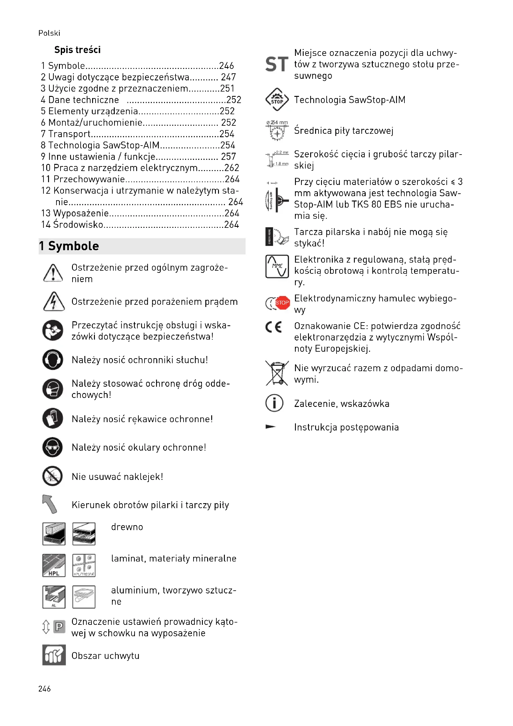 TKS 80 EBS jest wyposażony w rolki [1-20] słu żące do transportu na krótkich dystansach. ► Trzymać TKS 80 EBS za boczne uchwy ty [1-2] i przeciągnąć do żądanej pozycji. 8 Technologia SawStop‑AIM Technologia SawStop‑AIM pozwala uniknąć naj cięższych zranień. Sercem technologii SawStop‑AIM jest nabój, który wypycha aluminiowy blok przy pomocy sprężyny w kierunku tarczy pilarskiej. Mecha nizm jest uruchamiany przez czujnik pojemnoś ciowy, kiedy podczas pracy pilarki dojdzie do kontaktu z ludzką skórą lub innym przewodzą cym materiałem. Technologia SawStop‑AIM działa tylko z podłą czeniem listwy ochronnej i z uziemionym źród łem prądu. Upewnić się, że urządzenie nie jest zasilane przez SYS-PowerStation lub np. trans formator. Praca przy użyciu TKS 80 EBS jest możliwa tylko przy założonym naboju. OSTRZEŻENIE Dźwięk podczas uruchamiania technologii SawStop‑AIM Niebezpieczeństwo wypadku ► Używać ochronników słuchu. Zalecenie Technologia SawStop‑AIM uruchamia się ► Nie dotykać tarczy pilarskiej prowadnicą wzdłużną ani poprzeczną. Polski 254Zalecenie Aktywowana jest technologia SawStop‑AIM lub TKS 80 EBS nie uruchamia się. Zbyt mała odległość między tarczą pilarską a prowadnicą. ► Przy cięciu materiałów o szerokości ≤ 3 mm zastosować naddatek ≥ 19 mm.
