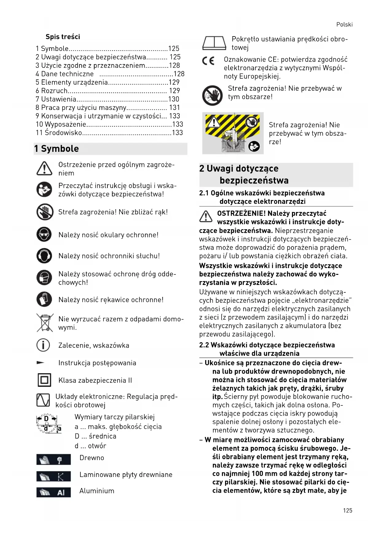 - 11 Środowisko 1 Symbole Ostrzeżenie przed ogólnym zagroże niem Przeczytać instrukcję obsługi i wska zówki dotyczące bezpieczeństwa! Strefa zagrożenia! Nie zbliżać rąk! Należy nosić okulary ochronne! Należy nosić ochronniki słuchu! Należy stosować ochronę dróg odde chowych! Należy nosić rękawice ochronne! Nie wyrzucać razem z odpadami domo wymi. Zalecenie, wskazówka Instrukcja postępowania Klasa zabezpieczenia II Układy elektroniczne: Regulacja pręd kości obrotowej p. 133