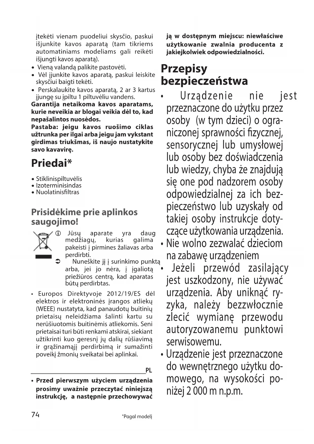 - Urządzenie jest przeznaczone do wewnętrznego użytku do- mowego, na wysokości po- niżej 2 000 m n.p.m. *Pagal modelį75