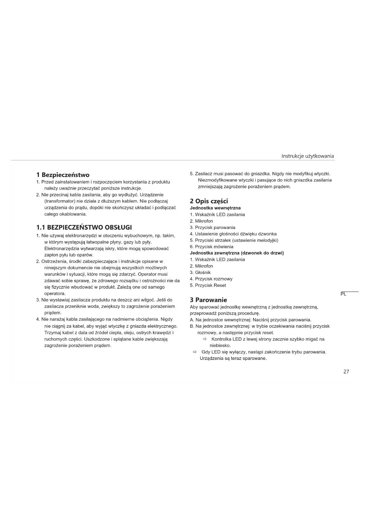 3 Parowanie Aby sparować jednostkę wewnętrzną z jednostką zewnętrzną, przeprowadź poniższą procedurę. A. Na jednostce wewnętrznej: Naciśnij przycisk parowania. B. Na jednostce zewnętrznej: w trybie oczekiwania naciśnij przycisk rozmowy, a następnie przycisk reset. ð Kontrolka LED z lewej strony zacznie szybko migać na niebiesko. ð Gdy LED się wyłączy, nastąpi zakończenie trybu parowania. Urządzenia są teraz sparowane. PLInstrukcje użytkowania