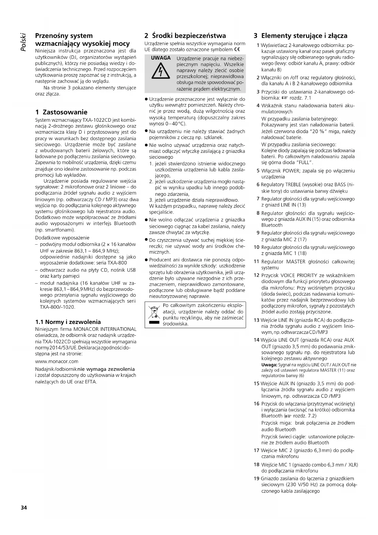 Niniejszym firma MONACOR INTERNATIONAL oświadcza, że odbiornik oraz nadajnik urządze-nia TXA-1022CD spełniają wszystkie wymagania normy 2014 / 53 / UE. Deklaracja zgodności do-stępna jest na stronie:www.monacor.comNadajnik / odbiornik nie wymaga zezwolenia i został dopuszczony do użytkowania w krajach należących do UE oraz EFTA. 2 Środki bezpieczeństwa Urządzenie spełnia wszystkie wymagania norm UE dlatego zostało oznaczone symbolem .UWAGAUrządzenie pracuje na niebez-piecznym napięciu. Wszelkie naprawy należy zlecić osobie przeszkolonej; nieprawidłowa obsługa może spowodować po-rażenie prądem elektrycznym. Urządzenie przeznaczone jest wyłącznie do użytku wewnątrz pomieszczeń. Należy chro-nić je przez wodą, dużą wilgotnością oraz wysoką temperaturą (dopuszczalny zakres wynosi 0 – 40 °C). Na urządzeniu nie należy stawiać żadnych pojemników z cieczą np. szklanek. Nie wolno używać urządzenia oraz natych-miast odłączyć wtyczkę zasilającą z gniazdka sieciowego jeżeli stwierdzono istnienie widocznego uszkodzenia urządzenia lub kabla zasila-jącego, jeżeli uszkodzenie urządzenia mogło nastą-pić w wyniku upadku lub innego podob-nego zdarzenia,3. jeżeli urządzenie działa nieprawidłowo.W każdym przypadku, naprawę należy zlecić specjaliście. Nie wolno odłączać urządzenia z gniazdka sieciowego ciągnąc za kabel zasilania, należy zawsze chwytać za wtyczkę. Do czyszczenia używać suchej miękkiej ście-reczki; nie używać wody ani środków che-micznych. Producent ani dostawca nie ponoszą odpo-wiedzialności za wynikłe szkody: uszkodzenie sprzętu lub obrażenia użytkownika, jeśli urzą-dzenie było używane niezgodnie z ich prze-znaczeniem, nieprawidłowo zamontowane, podłączone lub obsługiwane bądź poddane nieautoryzowanej naprawie.Po całkowitym zakończeniu eksplo-atacji, urządzenie należy oddać do punktu recyklingu, aby nie zaśmiecać środowiska. 3 Elementy sterujące i złącza 1 Wyświetlacz 2-kanałowego odbiornika: po-kazuje ustawiony kanał oraz pasek graficzny sygnalizujący siłę odbieranego sygnału radio-wego (lewy: odbiór kanału A, prawy: odbiór kanału B)2 Włączniki on / off oraz regulatory głośności, dla kanału A i B 2-kanałowego odbiornika Przyciski do ustawiania 2-kanałowego od-biornika: rozdz. 7.1 Wskaźnik stanu naładowania baterii aku-mulatorowych W przypadku zasilania bateryjnego: Pokazywany jest stan naładowania baterii. Jeżeli czerwona dioda “20 %” miga, należy naładować baterie.W przypadku zasilania sieciowego: Kolejne diody zapalają się podczas ładowania baterii. Po całkowitym naładowaniu zapala się górna dioda “FULL”. Włącznik POWER; zapala się po włączeniu urządzenia6 Regulatory TREBLE (wysokie) oraz BASS (ni-skie tony) do ustawiania barwy dźwięku Regulator głośności dla sygnału wejściowego z gniazd LINE IN (13) Regulator głośności dla sygnału wejścio-wego z gniazda AUX IN (15) oraz odbiornika Bluetooth Regulator głośności dla sygnału wejściowego z gniazda MIC 2 (17) Regulator głośności dla sygnału wejściowego z gniazda MIC 1 (18) Regulator MASTER głośności całkowitej systemu Przycisk VOICE PRIORITY ze wskaźnikiem diodowym dla funkcji priorytetu głosowego dla mikrofonu: Przy wciśniętym przycisku (dioda świeci), podczas nadawania komuni-katów przez nadajnik bezprzewodowy lub podłączony mikrofon, sygnały z pozostałych źródeł audio zostają przyciszone.13 Wejście LINE IN (gniazda RCA) do podłącza-nia źródła sygnału audio z wyjściem linio-wym, np. odtwarzacza CD / MP314 Wyjścia LINE OUT (gniazda RCA) oraz AUX OUT (gniazdo 3,5 mm) do podawania zmik-sowanego sygnału np. do rejestratora lub kolejnego zestawu aktywnegoUwaga: Sygnał na wyjściu LINE OUT / AUX OUT nie zależy od ustawień regulatora MASTER (11) oraz regulatorów barwy (6)15 Wejście AUX IN (gniazdo 3,5 mm) do pod-łączania źródła sygnału audio z wyjściem liniowym, np. odtwarzacza CD / MP3 Przycisk do włączania (przytrzymać wciśnięty) i wyłączania (wcisnąć na krótko) odbiornika Bluetooth ( rozdz. 7.2)Przycisk miga: brak połączenia ze źródłem audio BluetoothPrzycisk świeci ciągle: ustanowione połącze-nie ze źródłem audio Bluetooth 17 Wejście MIC 2 (gniazdo 6,3 mm) do podłą- czania mikrofonu Wejście MIC 1 (gniazdo combo 6,3 mm / XLR) do podłączania mikrofonu 19 Gniazdo zasilania do łączenia z gniazdkiem sieciowym (230 V/ 50 Hz) za pomocą dołą-czonego kabla zasilającegoPolskiPolski StronaSpis treści35 Polski