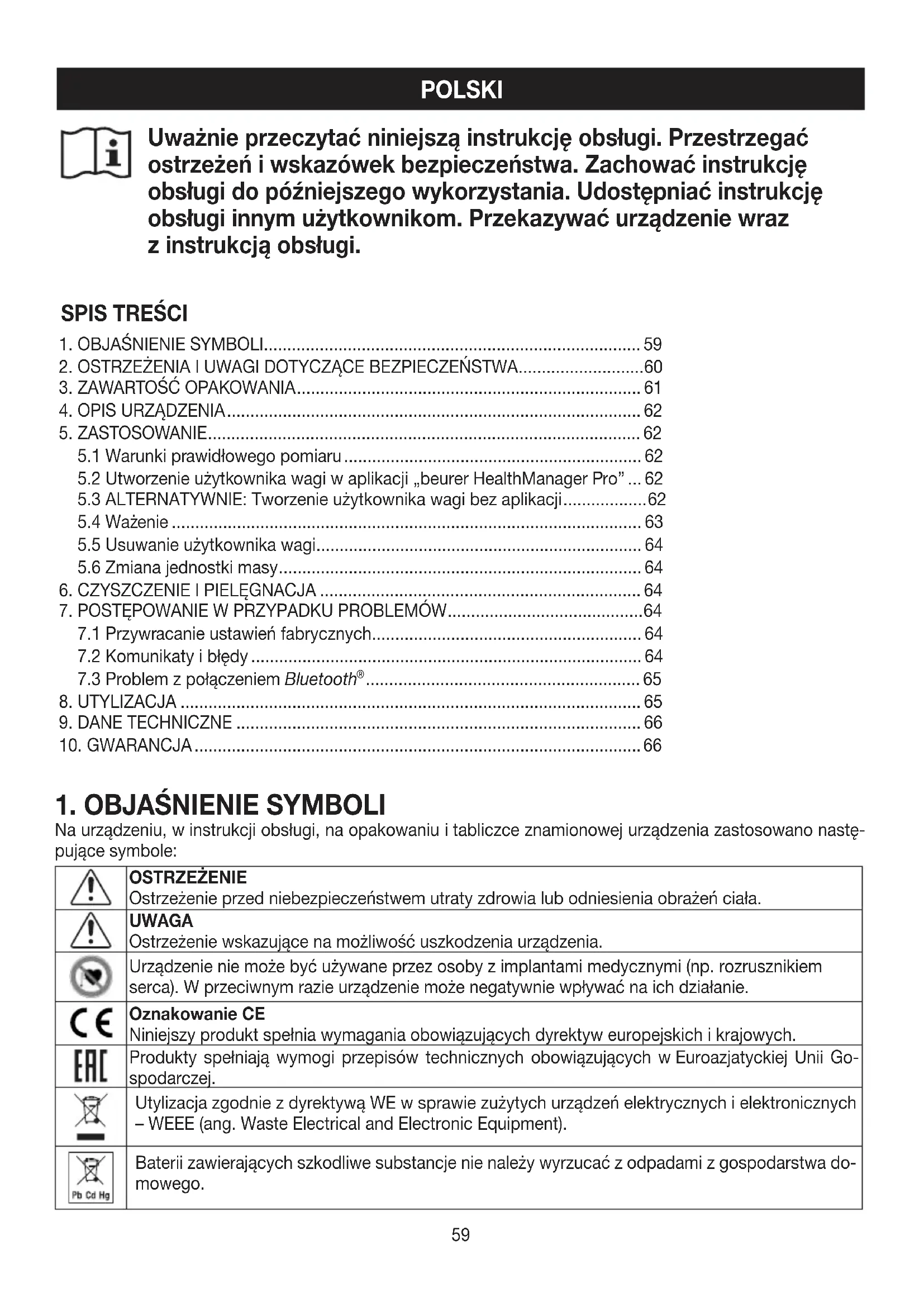 Naprawy mogą być wykonywane tylko przez serwis Beurer lub autoryzowanego dystrybutora. Nigdy nie otwierać wagi samodzielnie. Instrukcje bezpieczeństwa dotyczące postępowania zbateriami