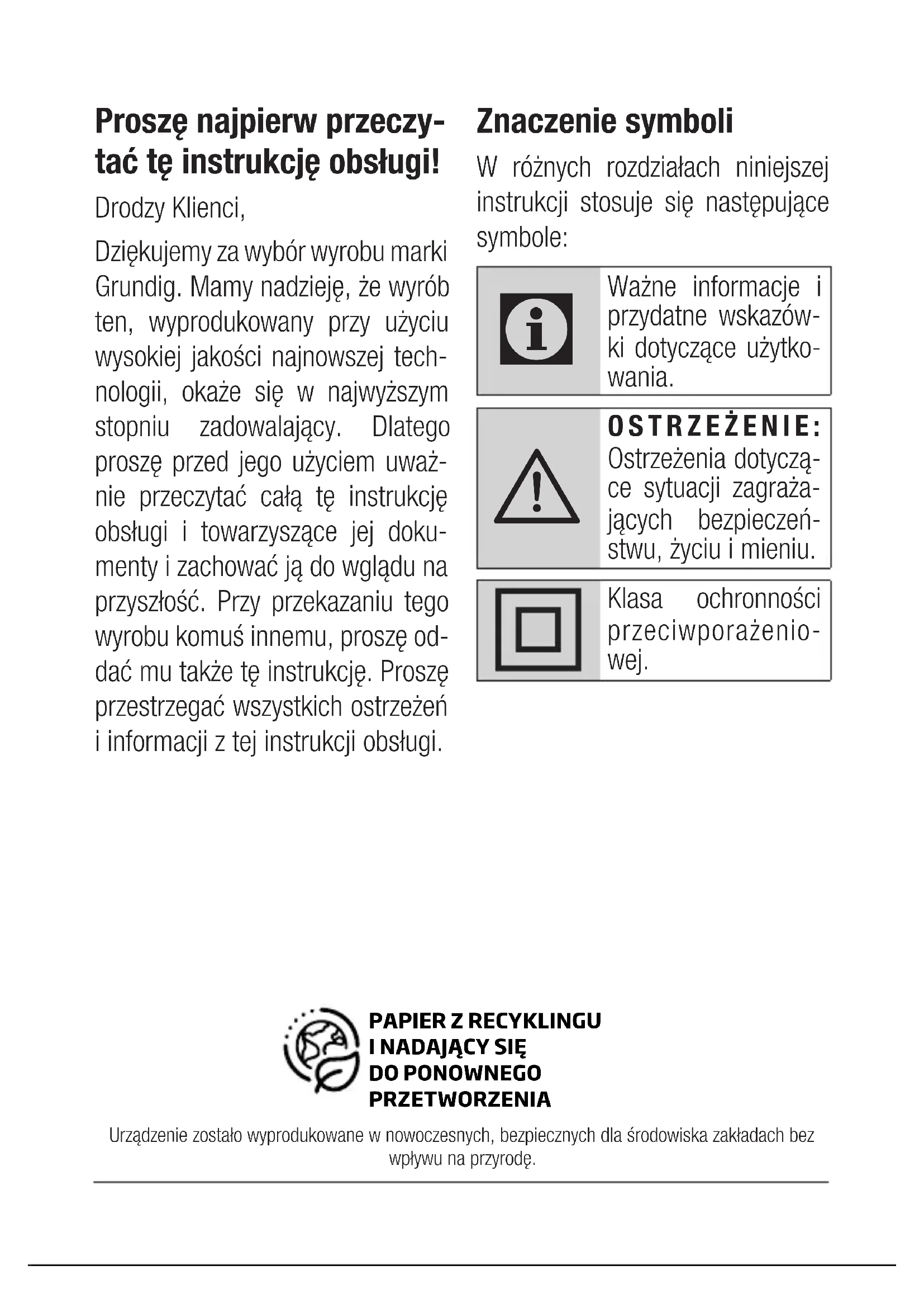 - Pazite da se uređaj nalazi izvan dosega djece. 4 Informacije Prilikom puštanja u pogon, opće uporabe i čišćenja obratite pozor-nost na upute na stranicama 4-5 ovog priručnika.Proszę najpierw przeczy- tać tę instrukcję obsługi! Drodzy Klienci, Dziękujemy za wybór wyrobu marki Grundig. Mamy nadzieję, że wyrób ten, wyprodukowany przy użyciu wysokiej jakości najnowszej tech- nologii, okaże się w najwyższym stopniu zadowalający. Dlatego proszę przed jego użyciem uważ- nie przeczytać całą tę instrukcję obsługi i towarzyszące jej doku- menty i zachować ją do wglądu na przyszłość. Przy przekazaniu tego wyrobu komuś innemu, proszę od- dać mu także tę instrukcję. Proszę przestrzegać wszystkich ostrzeżeń i informacji z tej instrukcji obsługi. Znaczenie symboli W różnych rozdziałach niniejszej instrukcji stosuje się następujące symbole: