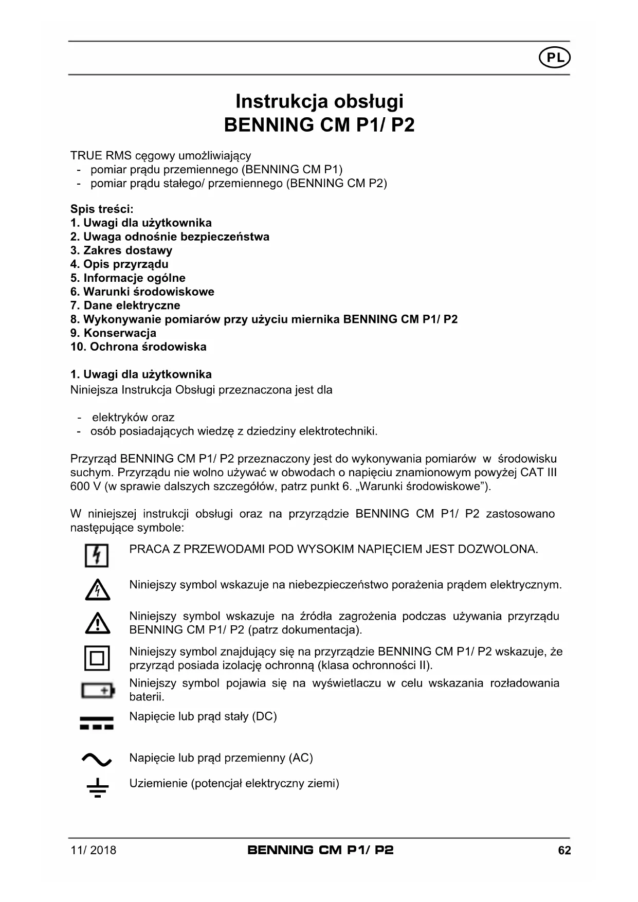 TRUE RMS cęgowy umożliwiający - pomiar prądu przemiennego (BENNING CM P1) - pomiar prądu stałego/ przemiennego (BENNING CM P2)Spis treści: 1. Uwagi dla użytkownika 2. Uwaga odnośnie bezpieczeństwa 3. Zakres dostawy 4. Opis przyrządu 5. Informacje ogólne 6. Warunki środowiskowe 7. Dane elektryczne 8. Wykonywanie pomiarów przy użyciu miernika BENNING CM P1/ P29. Konserwacja 10. Ochrona środowiska 1. Uwagi dla użytkownika Niniejsza Instrukcja Obsługi przeznaczona jest dla - elektryków oraz - osób posiadających wiedzę z dziedziny elektrotechniki. Przyrząd BENNING CM P1/ P2 przeznaczony jest do wykonywania pomiarów w środowisku suchym. Przyrządu nie wolno używać w obwodach o napięciu znamionowym powyżej CAT III 600 V (w sprawie dalszych szczegółów, patrz punkt 6. „Warunki środowiskowe”). W niniejszej instrukcji obsługi oraz na przyrządzie BENNING CM P1/ P2 zastosowano następujące symbole:PRACA Z PRZEWODAMI POD WYSOKIM NAPIĘCIEM JEST DOZWOLONA. Niniejszy symbol wskazuje na niebezpieczeństwo porażenia prądem elektrycznym.