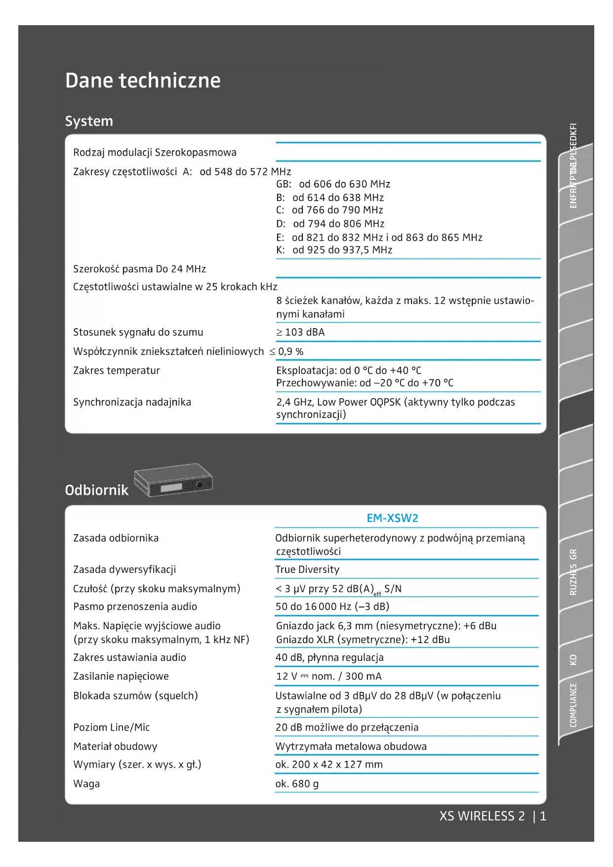 COMPLIANCE Dane techniczne Rodzaj modulacji Szerokopasmowa Zakresy częstotliwości A: od 548 do 572 MHz GB: od 606 do 630 MHz B: od 614 do 638 MHz C: od 766 do 790 MHz D: od 794 do 806 MHz E: od 821 do 832 MHz i od 863 do 865 MHz K: od 925 do 937,5 MHz Szerokość pasma Do 24 MHz Częstotliwości ustawialne w 25 krokach kHz 8 ścieżek kanałów, każda z maks. 12 wstępnie ustawio- nymi kanałami Stosunek sygnału do szumu ≥ 103 dBA Współczynnik zniekształceń nieliniowych ≤ 0,9 % Zakres temperatur Eksploatacja: od 0 °C do +40 °C Przechowywanie: od –20 °C do +70 °C Synchronizacja nadajnika 2,4 GHz, Low Power OQPSK (aktywny tylko podczas synchronizacji) System EM-XSW2 Zasada odbiornika Odbiornik superheterodynowy z podwójną przemianą częstotliwości Zasada dywersyfikacji True Diversity Czułość (przy skoku maksymalnym) < 3 μV przy 52 dB(A) eff S/N Pasmo przenoszenia audio 50 do 16 000 Hz ( –3 dB) Maks. Napięcie wyjściowe audio (przy skoku maksymalnym, 1 kHz NF) Gniazdo jack 6,3 mm (niesymetryczne): +6 dBu Gniazdo XLR (symetryczne): +12 dBu Zakres ustawiania audio 40 dB, płynna regulacja Zasilanie napięciowe 12 V ⎓ nom. / 300 mA Blokada szumów (squelch) Ustawialne od 3 dBμV do 28 dBμV (w połączeniu z sygnałem pilota) Poziom Line/Mic 20 dB możliwe do przełączenia Materiał obudowy Wytrzymała metalowa obudowa Wymiary (szer. x wys. x gł.) ok. 200 x 42 x 127 mm Waga ok. 680 g Odbiornik2 | XS WIRELESS 2 Nadajnik SK-XSW SKM-XSW e 835 e 865 Moc wyjściowa HF 10 mW Pasmo przenoszenia audio od 50 do 16 000 Hz (Line) od 80 do 16 000 Hz (Mic) od 80 do 16000 Hz Wejście audio Gniazdo jack 3,5 mm – Maks. napięcie wejściowe (Mic/Line) przy 3 % współczyn- niku zniekształceń nieliniowych typ. 1,5 V RMS Mic/ typ. 2,6 V RMS Line @ –30 dB Gain