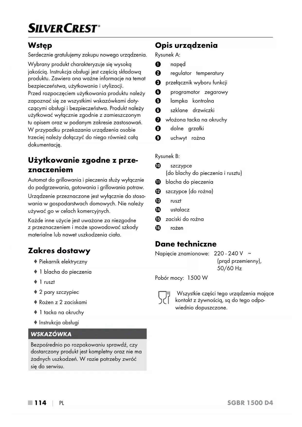 - Przepisy SGBR 1500 D4 ■ 114 │ PL Wstęp Serdecznie gratulujemy zakupu nowego urządzenia. Wybrany produkt charakteryzuje się wysoką jakością. Instrukcja obsługi jest częścią składową produktu. Zawiera ona ważne informacje na temat bezpieczeństwa, użytkowania iutylizacji. Przed rozpoczęciem użytkowania produktu należy zapoznać się ze wszystkimi wskazówkami doty- czącymi obsługi ibezpieczeństwa. Produkt należy użytkować wyłącznie zgodnie zzamieszczonym tu opisem oraz wpodanym zakresie zastosowań. Wprzypadku przekazania urządzenia osobie trzeciej należy dołączyć do niego również całą dokumentację. Użytkowanie zgodne z prze- znaczeniem Automat do grillowania i pieczenia służy wyłącznie do podgrzewania, gotowania i grillowania potraw. Urządzenie przeznaczone jest wyłącznie do stoso- wania wgospodarstwach domowych. Nie należy używać go w celach komercyjnych. Każde inne użycie jest uważane za niezgodne z przeznaczeniem i może spowodować szkody materialne lub nawet uszkodzenia ciała. Zakres dostawy ♦ Piekarnik elektryczny ♦ 1 blacha do pieczenia ♦ 1 ruszt ♦ 2 pary szczypiec ♦ Rożen z 2 zaciskami ♦ 1 tacka na okruchy ♦ Instrukcja obsługi WSKAZÓWKA Bezpośrednio po rozpakowaniu sprawdź, czy dostarczony produkt jest kompletny oraz nie ma żadnych uszkodzeń. Wrazie potrzeby zwróć się do serwisu. Opis urządzenia Rysunek A: 1 napęd 2 regulator temperatury 3 przełącznik wyboru funkcji 4 programator zegarowy 5 lampka kontrolna 6 szklane drzwiczki 7 włożona tacka na okruchy 8 dolne grzałki 9 uchwyt rożna Rysunek B: 0 szczypce (do blachy do pieczenia i rusztu) q blacha do pieczenia w szczypce (do rożna) e ruszt r ustalacz t zaciski do rożna z rożen Dane techniczne Napięcie znamionowe: 220 - 240 V p. 129