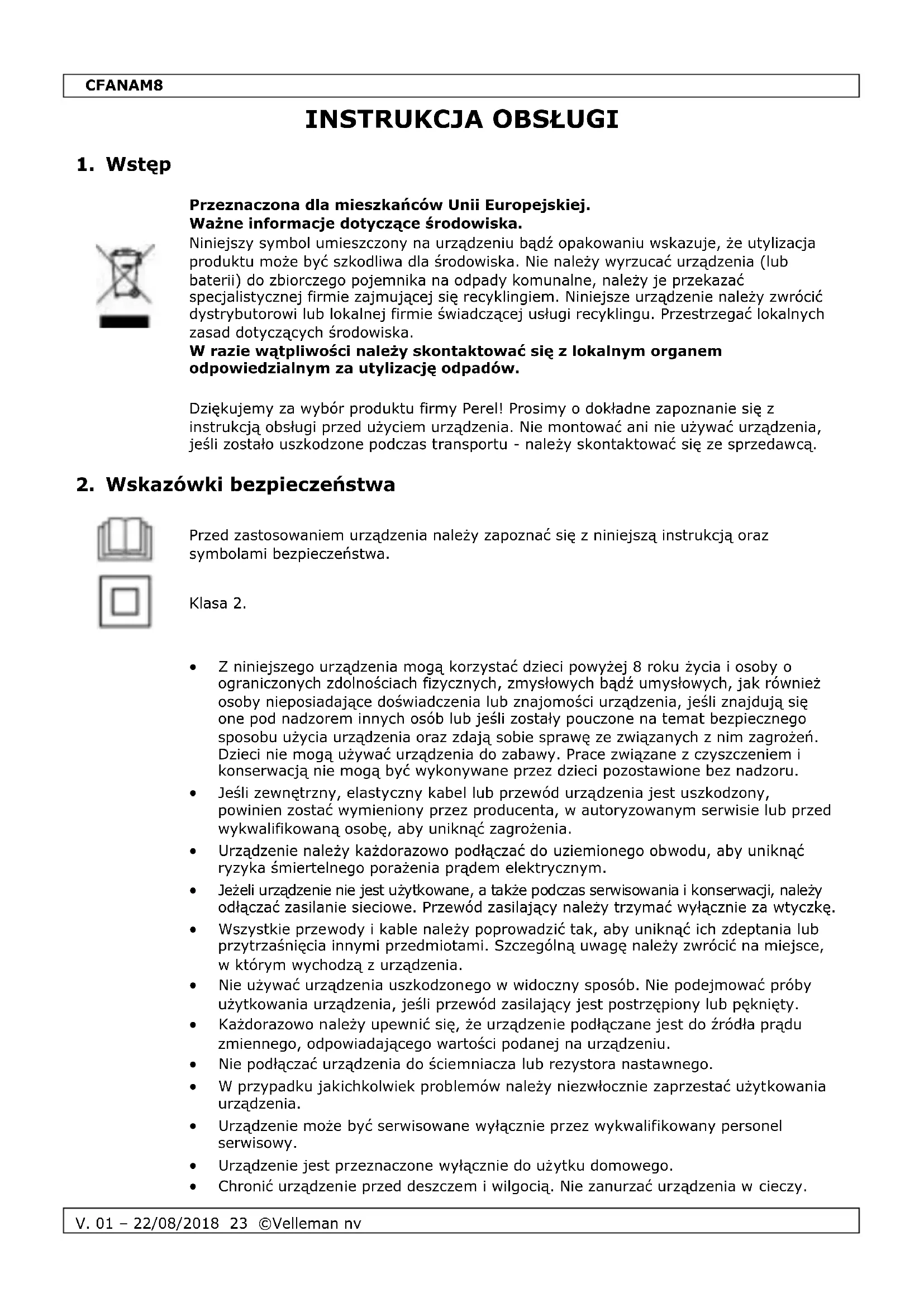 Dziękujemy za wybór produktu firmy Perel! Prosimy o dokładne zapoznanie się z instrukcją obsługi przed użyciem urządzenia. Nie montować ani nie używać urządzenia, jeśli zostało uszkodzone podczas transportu - należy skontaktować się ze sprzedawcą.