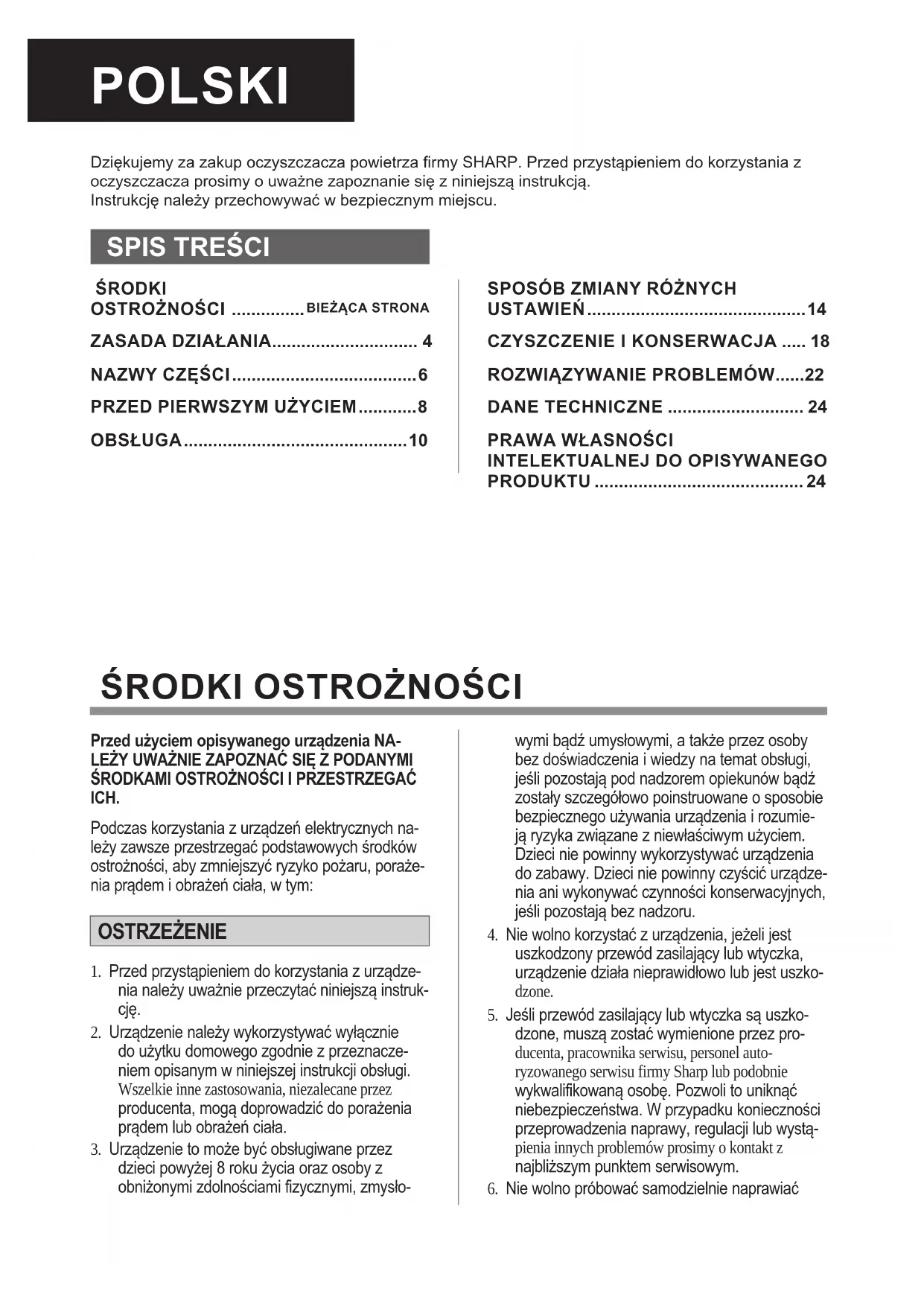 Dziękujemy za zakup oczyszczacza powietrza firmy SHARP. Przed przystąpieniem do korzystania z oczyszczacza prosimy o uważne zapoznanie się z niniejszą instrukcją.Instrukcję należy przechowywać w bezpiecznym miejscu. POLSKI ŚRODKI OSTROŻNOŚCI ...............