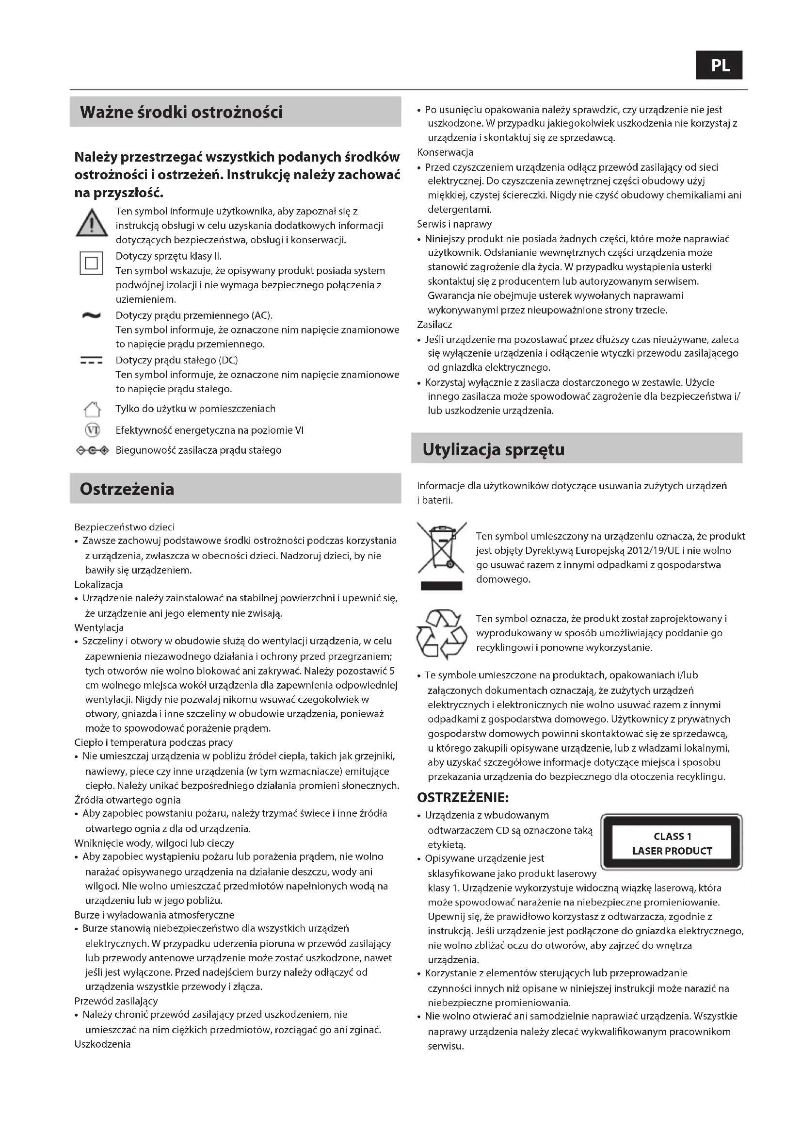 - Probeer de fabrieksinstellingen te herstellen. Raadpleeg de sectie 'Terugzetten naar fabrieksinstelling'. OPMERKING: Al uw instellingen, inclusief de radiostation- lijst, verbonden Bluetooth-apparaten en eventuele voorin- stellingen worden gewist wanneer u de microset reset.PL Ważne środki ostrożności Należy przestrzegać wszystkich podanych środków ostrożności i ostrzeżeń. Instrukcję należy zachować na przyszłość. CAUTION