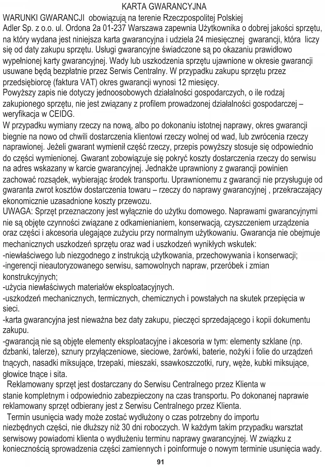 ИЗПОЛЗВАНЕ НА ГРЕБЕНА ЗА БИКИНИ Поставете гребена за бикини (8) върху бръснещата глава (5). Натиснете внимателно, за да чуете звука на щракване. Включете самобръсначката, като преместите ключа за включване/изключване нагоре (6). ТЕХНИЧЕСКИ ДАННИ: Батерия: 2xAAA (1.5V) За да защитите околната си среда: моля, отделете картонените кутии и найлоновите торбички и ги изхвърлете в съответните кошчета за отпадъци. Използваният уред трябва да бъде доставен до специалните пунктове за събиране, които могат да повлияят на околната среда. Не изхвърляйте този уред в обикновен кош за отпадъци.91 WARUNKI GWARANCJI obowiązują na terenie Rzeczpospolitej Polskiej Adler Sp. z o.o. ul. Ordona 2a 01-237 Warszawa zapewnia Użytkownika o dobrej jakości sprzętu, na który wydana jest niniejsza karta gwarancyjna i udziela 24 miesięcznej gwarancji, która liczy się od daty zakupu sprzętu. Usługi gwarancyjne świadczone są po okazaniu prawidłowo wypełnionej karty gwarancyjnej. Wady lub uszkodzenia sprzętu ujawnione w okresie gwarancji usuwane będą bezpłatnie przez Serwis Centralny. W przypadku zakupu sprzętu przez przedsiębiorcę (faktura VAT) okres gwarancji wynosi 12 miesięcy. Powyższy zapis nie dotyczy jednoosobowych działalności gospodarczych, o ile rodzaj zakupionego sprzętu, nie jest związany z profilem prowadzonej działalności gospodarczej – weryfikacja w CEIDG. W przypadku wymiany rzeczy na nową, albo po dokonaniu istotnej naprawy, okres gwarancji biegnie na nowo od chwili dostarczenia klientowi rzeczy wolnej od wad, lub zwrócenia rzeczy naprawionej. Jeżeli gwarant wymienił część rzeczy, przepis powyższy stosuje się odpowiednio do części wymienionej. Gwarant zobowiązuje się pokryć koszty dostarczenia rzeczy do serwisu na adres wskazany w karcie gwarancyjnej. Jednakże uprawniony z gwarancji powinien zachować rozsądek, wybierając środek transportu. Uprawnionemu z gwarancji nie przysługuje od gwaranta zwrot kosztów dostarczenia towaru – rzeczy do naprawy gwarancyjnej , przekraczający ekonomicznie uzasadnione koszty przewozu. UWAGA: Sprzęt przeznaczony jest wyłącznie do użytku domowego. Naprawami gwarancyjnymi nie są objęte czynności związane z odkamienianiem, konserwacją, czyszczeniem urządzenia oraz części i akcesoria ulegające zużyciu przy normalnym użytkowaniu. Gwarancja nie obejmuje mechanicznych uszkodzeń sprzętu oraz wad i uszkodzeń wynikłych wskutek: -niewłaściwego lub niezgodnego z instrukcją użytkowania, przechowywania i konserwacji; KARTA GWARANCYJNA -gwarancją nie są objęte elementy eksploatacyjne i akcesoria w tym: elementy szklane (np. dzbanki, talerze), sznury przyłączeniowe, sieciowe, żarówki, baterie, nożyki i folie do urządzeń tnących, nasadki miksujące, trzepaki, mieszaki, ssawkoszczotki, rury, węże, kubki miksujące, głowice tnące i sita. -uszkodzeń mechanicznych, termicznych, chemicznych i powstałych na skutek przepięcia w sieci. -ingerencji nieautoryzowanego serwisu, samowolnych napraw, przeróbek i zmian konstrukcyjnych; -karta gwarancyjna jest nieważna bez daty zakupu, pieczęci sprzedającego i kopii dokumentu zakupu. Termin usunięcia wady może zostać wydłużony o czas potrzebny do importu niezbędnych części, nie dłuższy niż 30 dni roboczych. W każdym takim przypadku warsztat serwisowy powiadomi klienta o wydłużeniu terminu naprawy gwarancyjnej. W związku z koniecznością sprowadzenia części zamiennych i poinformuje o nowym terminie usunięcia wady. Reklamowany sprzęt jest dostarczany do Serwisu Centralnego przez Klienta w stanie kompletnym i odpowiednio zabezpieczony na czas transportu. Po dokonanej naprawie reklamowany sprzęt odbierany jest z Serwisu Centralnego przez Klienta. -użycia niewłaściwych materiałów eksploatacyjnych.92 W przypadku stwierdzenia usterki należy ją zgłosić w punkcie sprzedaży lub w Serwisie Centralnym, ul. Ordona 2A, 01-237 Warszawa, tel. 728-595-006 lub e-mail: serwis@adler.com.pl. Gwarancja nie wyłącza ani nie ogranicza oraz nie zawiesza uprawnień kupującego wynikających z przepisów o rękojmi za wady rzeczy sprzedanej. W zgłoszeniu proszę podać swój adres, nr telefonu i opis usterki. Do reklamacji konieczne jest dołączenie kopii dokumentu zakupu. SERWIS CENTRALNY 01-237 Warszawa ul.Ordona 2A tel. 728 - 595 - 006 serwis@adler.com.pl www.adler.com.pl (data sprzedaży) (pieczątka sklepu i podpis sprzedawcy) adnotacje serwisu: Urządzenia nie wyrzucać do pojemnika na odpady komunalne! W trosce o środowisko.. Zużyty sprzęt elektryczny, to odpady, które zawierają substancje szkodliwe dla ludzi, zwierząt i środowiska. Substancje te mogą doprowadzić do zanieczyszczenia gleby, wody lub powietrze, a poprzez to mogą się dostać do organizmu człowieka i doprowadzić do licznych dolegliwości zdrowotnych, takich jak: zaburzenia wzroku, słuchu, mowy, mogą również doprowadzić do uszkodzenia nerek, wątroby i serca, oraz wywołać choroby skóry. Substancje szkodliwe mogą mieć również niekorzystny wpływ na układ oddechowy i rozrodczy oraz doprowadzić do zamian nowotworowych. Spożycie roślin rosnących na skażonych glebach, oraz produktów powstałych z nich może grozić w/w skutkami zdrowotnymi. Opakowania kartonowe oraz worki polietylenowe (PE) należy wrzucać do odpowiednich pojemników przeznaczonych do selektywnej zbiórki odpadów komunalnych zgodnie z ich opisem. Jeżeli w urządzeniu znajdują się baterie, należy je wyjąć i osobno oddać do p