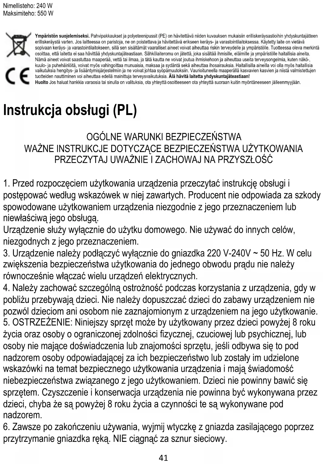 życia oraz osoby o ograniczonej zdolności fizycznej, czuciowej lub psychicznej, lub osoby nie mające doświadczenia lub znajomości sprzętu, jeśli odbywa się to pod nadzorem osoby odpowiadającej za ich bezpieczeństwo lub zostały im udzielone wskazówki na temat bezpiecznego użytkowania urządzenia i mają świadomość niebezpieczeństwa związanego z jego użytkowaniem. Dzieci nie powinny bawić się sprzętem. Czyszczenie i konserwacja urządzenia nie powinna być wykonywana przez dzieci, chyba że są powyżej 8 roku życia a czynności te są wykonywane pod nadzorem.