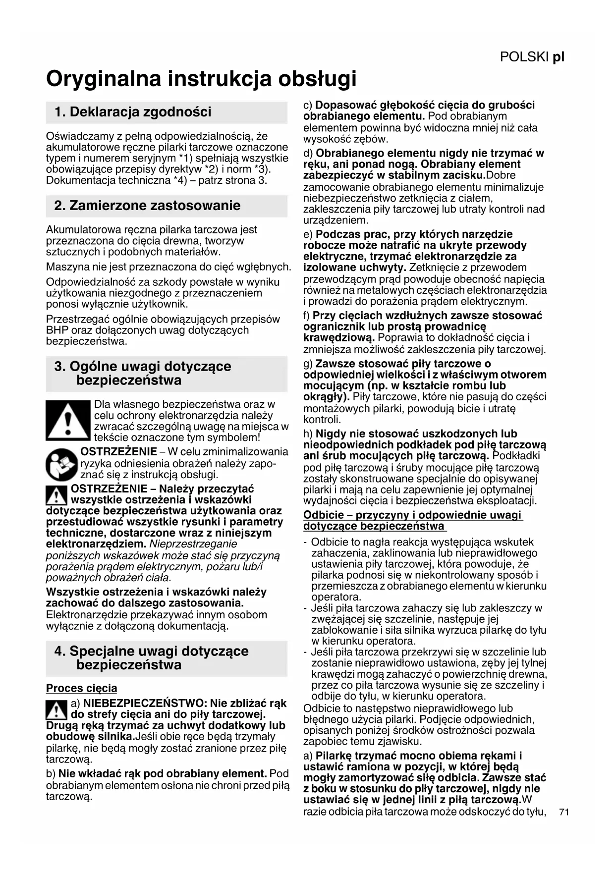 Oryginalna instrukcja obsługi Oświadczamy z pełną odpowiedzialnością, że akumulatorowe ręczne pilarki tarczowe oznaczone typem i numerem seryjnym *1) spełniają wszystkie obowiązujące przepisy dyrektyw *2) i norm *3). Dokumentacja techniczna *4) – patrz strona 3. Akumulatorowa ręczna pilarka tarczowa jest przeznaczona do cięcia drewna, tworzyw sztucznych i podobnych materiałów. Maszyna nie jest przeznaczona do cięć wgłębnych. Odpowiedzialność za szkody powstałe w wyniku użytkowania niezgodnego z przeznaczeniem ponosi wyłącznie użytkownik. Przestrzegać ogólnie obowiązujących przepisów BHP oraz dołączonych uwag dotyczących bezpieczeństwa. Dla własnego bezpieczeństwa oraz w celu ochrony elektronarzędzia należy zwracać szczególną uwagę na miejsca w tekście oznaczone tym symbolem! OSTRZEŻENIE – W celu zminimalizowania ryzyka odniesienia obrażeń należy zapo- zna ć się z instrukcją obsługi. OSTRZEŻENIE – Należy przeczytać wszystkie ostrzeżenia i wskazówki dotyczące bezpieczeństwa użytkowania oraz przestudiować wszystkie rysunki i parametry techniczne, dostarczone wraz z niniejszym elektronarzędziem. Nieprzestrzeganie poniższych wskazówek może stać się przyczyną porażenia prądem elektrycznym, pożaru lub/i poważnych obrażeń ciała. Wszystkie ostrzeżenia i wskazówki należy zachować do dalszego zastosowania. Elektronarzędzie przekazywać innym osobom wyłącznie z dołączoną dokumentacją. Proces cięcia a) NIEBEZPIECZEŃSTWO: Nie zbliżać rąk do strefy cięcia ani do piły tarczowej. Drugą ręką trzymać za uchwyt dodatkowy lub obudowę silnika.Jeśli obie ręce będą trzymały pilarkę, nie będą mogły zostać zranione przez piłę tarczową. b) Nie wkładać rąk pod obrabiany element. Pod obrabianym elementem osłona nie chroni przed piłą tarczową. c) Dopasować głębokość cięcia do grubości obrabianego elementu. Pod obrabianym elementem powinna być widoczna mniej niż cała wysokość zębów. d) Obrabianego elementu nigdy nie trzymać w ręku, ani ponad nogą. Obrabiany element zabezpieczyć w stabilnym zacisku.Dobre zamocowanie obrabianego elementu minimalizuje niebezpieczeństwo zetknięcia z ciałem, zakleszczenia piły tarczowej lub utraty kontroli nad urządzeniem. e) Podczas prac, przy których narzędzie robocze może natrafić na ukryte przewody elektryczne, trzymać elektronarzędzie za izolowane uchwyty. Zetknięcie z przewodem przewodzącym prąd powoduje obecność napięcia również na metalowych częściach elektronarzędzia i prowadzi do porażenia prądem elektrycznym. f) Przy cięciach wzdłużnych zawsze stosować ogranicznik lub prostą prowadnicę krawędziową. Poprawia to dokładność cięcia i zmniejsza możliwość zakleszczenia piły tarczowej. g) Zawsze stosować pi ły tarczowe o odpowiedniej wielkości i z właściwym otworem mocującym (np. w kształcie rombu lub okrągły). Piły tarczowe, które nie pasują do części montażowych pilarki, powodują bicie i utratę kontroli. h) Nigdy nie stosować uszkodzonych lub nieodpowiednich podkładek pod piłę tarczową ani śrub mocujących piłę tarczową. Podkładki pod piłę tarczową i śruby mocujące piłę tarczową zostały skonstruowane specjalnie do opisywanej pilarki i mają na celu zapewnienie jej optymalnej wydajności cięcia i bezpieczeństwa eksploatacji. Odbicie – przyczyny i odpowiednie uwagi dotyczące bezpieczeństwa - Odbicie to nagła reakcja występująca wskutek zahaczenia, zaklinowania lub nieprawidłowego ustawienia piły tarczowej, która powoduje, że pilarka podnosi się w niekontrolowany sposób i przemieszcza z obrabianego elementu w kierunku operatora. -Jeśli piła tarczowa zahaczy się lub zakleszczy w zwężającej się szczelinie, następuje jej zablokowanie i siła silnika wyrzuca pilarkę do tyłu w kierunku operatora. -Jeśli piła tarczowa przekrzywi się w szczelinie lub zostanie nieprawidłowo ustawiona, zęby jej tylnej krawędzi mogą zahaczyć o powierzchnię drewna, przez co piła tarczowa wysunie się ze szczeliny i odbije do tyłu, w kierunku operatora. Odbicie to następstwo nieprawidłowego lub błędnego użycia pilarki. Podjęcie odpowiednich, opisanych poniżej środków ostrożności pozwala zapobiec temu zjawisku. a) Pilarkę trzymać mocno obiema rękami i ustawić ramiona w pozycji, w której będą mogły zamortyzować siłę odbicia. Zawsze stać z boku w stosunku do piły tarczowej, nigdy nie ustawiać się w jednej linii z piłą tarczową.W razie odbicia piła tarczowa może odskoczyć do tyłu,