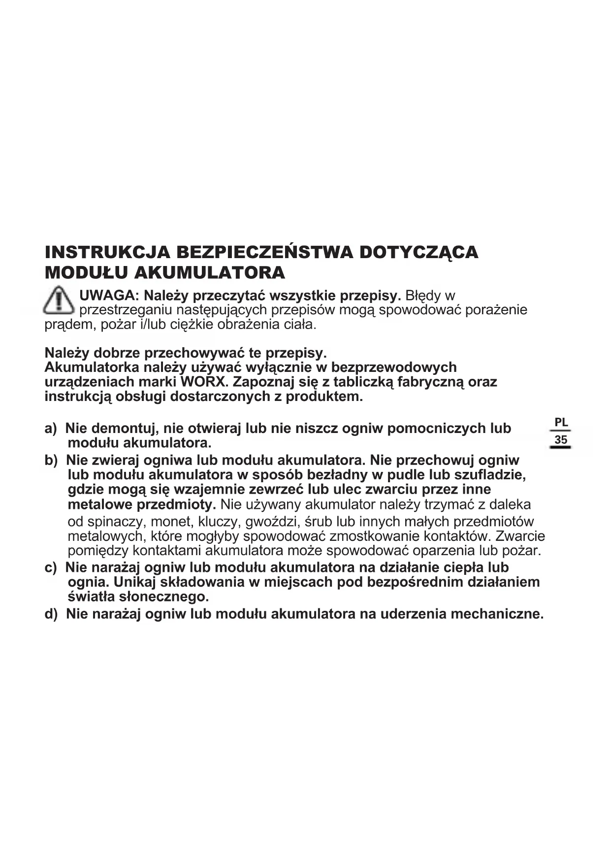 UWAGA: Należy przeczytać wszystkie przepisy. Błędy w przestrzeganiu następujących przepisów mogą spowodować porażenie prądem, pożar i/lub ciężkie obrażenia ciała. Należy dobrze przechowywać te przepisy. Akumulatorka należy używać wyłącznie w bezprzewodowych urządzeniach marki WORX. Zapoznaj się z tabliczką fabryczną oraz instrukcją obsługi dostarczonych z produktem. a) Nie demontuj, nie otwieraj lub nie niszcz ogniw pomocniczych lub modułu akumulatora. b) Nie zwieraj ogniwa lub modułu akumulatora. Nie przechowuj ogniw lub modułu akumulatora w sposób bezładny w pudle lub szuadzie, gdzie mogą się wzajemnie zewrzeć lub ulec zwarciu przez inne metalowe przedmioty. Nie używany akumulator należy trzymać z daleka od spinaczy, monet, kluczy, gwoździ, śrub lub innych małych przedmiotów metalowych, które mogłyby spowodować zmostkowanie kontaktów. Zwarcie pomiędzy kontaktami akumulatora może spowodować oparzenia lub pożar. c) Nie narażaj ogniw lub modułu akumulatora na działanie ciepła lub ognia. Unikaj składowania w miejscach pod bezpośrednim działaniem światła słonecznego. d) Nie narażaj ogniw lub modułu akumulatora na uderzenia mechaniczne.36