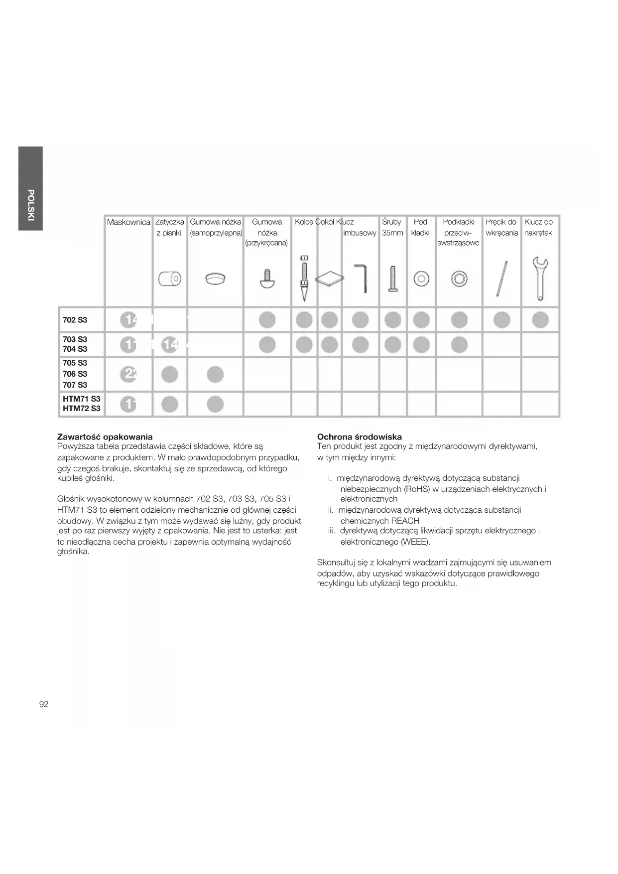 POLSKI Zawartość opakowania Powyższa tabela przedstawia części składowe, które są zapakowane z produktem. W mało prawdopodobnym przypadku, gdy czegoś brakuje, skontaktuj się ze sprzedawcą, od którego kupiłeś głośniki. Głośnik wysokotonowy w kolumnach 702 S3, 703 S3, 705 S3 i HTM71 S3 to element odzielony mechanicznie od głównej części obudowy. W związku z tym może wydawać się luźny, gdy produkt jest po raz pierwszy wyjęty z opakowania. Nie jest to usterka: jest to nieodłączna cecha projektu i zapewnia optymalną wydajność głośnika. Ochrona środowiska Ten produkt jest zgodny z międzynarodowymi dyrektywami, wtym między innymi: