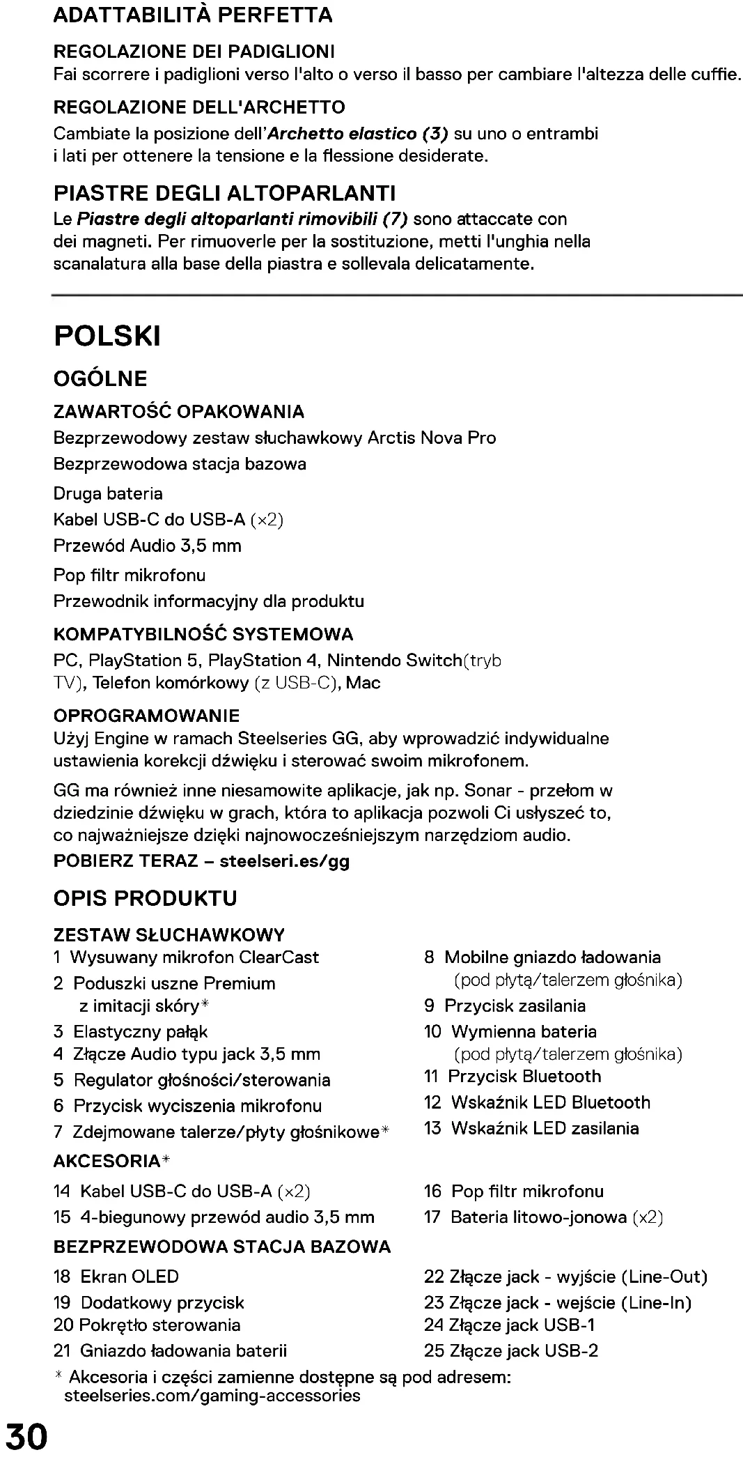 Le Piastre degli altoparlanti rimovibili (7) sono attaccate con dei magneti. Per rimuoverle per la sostituzione, metti l'unghia nella scanalatura alla base della piastra e sollevala delicatamente. POLSKI OGÓLNE ZAWARTOŚĆ OPAKOWANIA Bezprzewodowy zestaw słuchawkowy Arctis Nova Pro Bezprzewodowa stacja bazowa Druga bateria Kabel USB-C do USB-A (×2) Przewód Audio 3,5mm Pop ltr mikrofonu Przewodnik informacyjny dla produktu KOMPATYBILNOŚĆ SYSTEMOWA PC, PlayStation 5, PlayStation 4, Nintendo Switch(tryb TV), Telefon komórkowy (z USB-C), Mac OPROGRAMOWANIE Użyj Engine w ramach Steelseries GG, aby wprowadzić indywidualne ustawienia korekcji dźwięku i sterować swoim mikrofonem. GG ma również inne niesamowite aplikacje, jak np. Sonar - przełom w dziedzinie dźwięku w grach, która to aplikacja pozwoli Ci usłyszeć to, co najważniejsze dzięki najnowocześniejszym narzędziom audio. POBIERZ TERAZ – steelseri.es/gg OPIS PRODUKTU