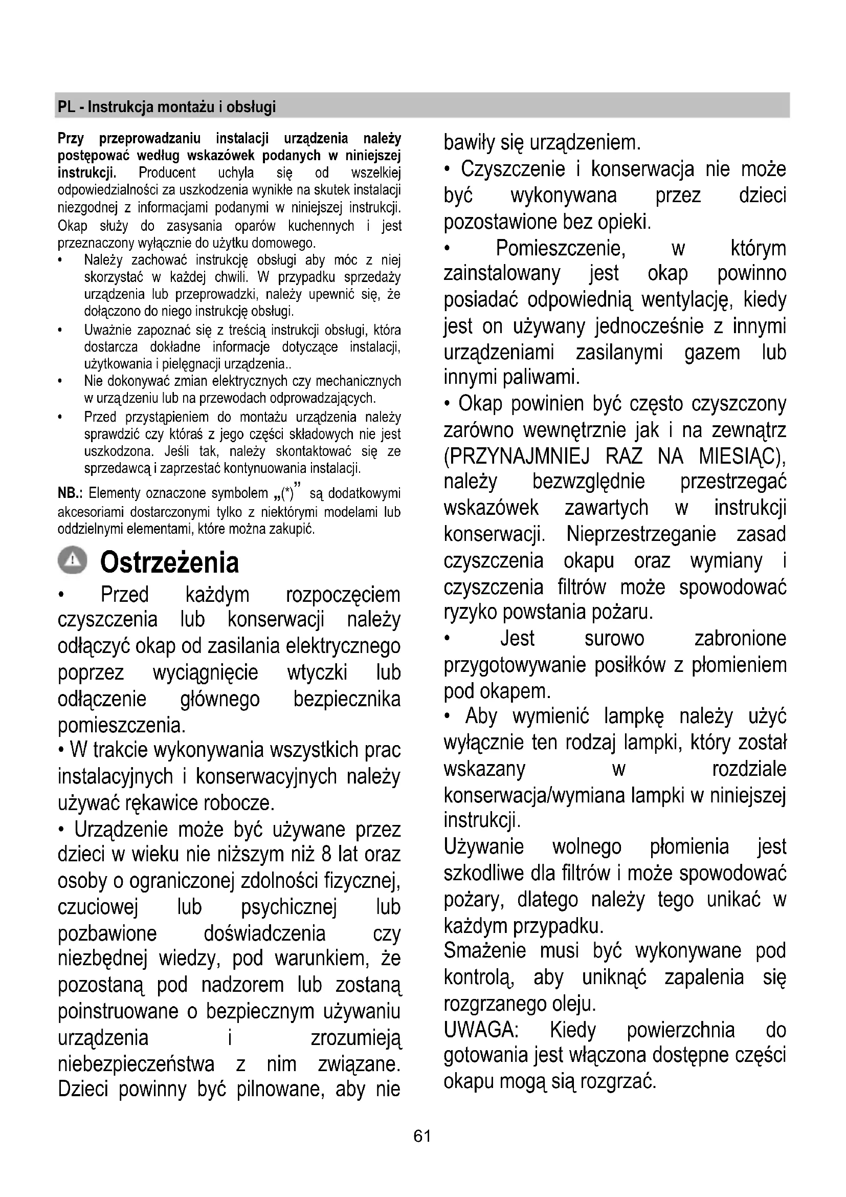 - Aby wymienić lampkę należy użyć wyłącznie ten rodzaj lampki, który został wskazany w rozdziale konserwacja/wymiana lampki w niniejszej instrukcji. Używanie wolnego płomienia jest szkodliwe dla filtrów i może spowodować pożary, dlatego należy tego unikać w każdym przypadku. Smażenie musi być wykonywane pod kontrolą, aby uniknąć zapalenia się rozgrzanego oleju. UWAGA: Kiedy powierzchnia do gotowania jest włączona dostępne części okapu mogą sią rozgrzać.62