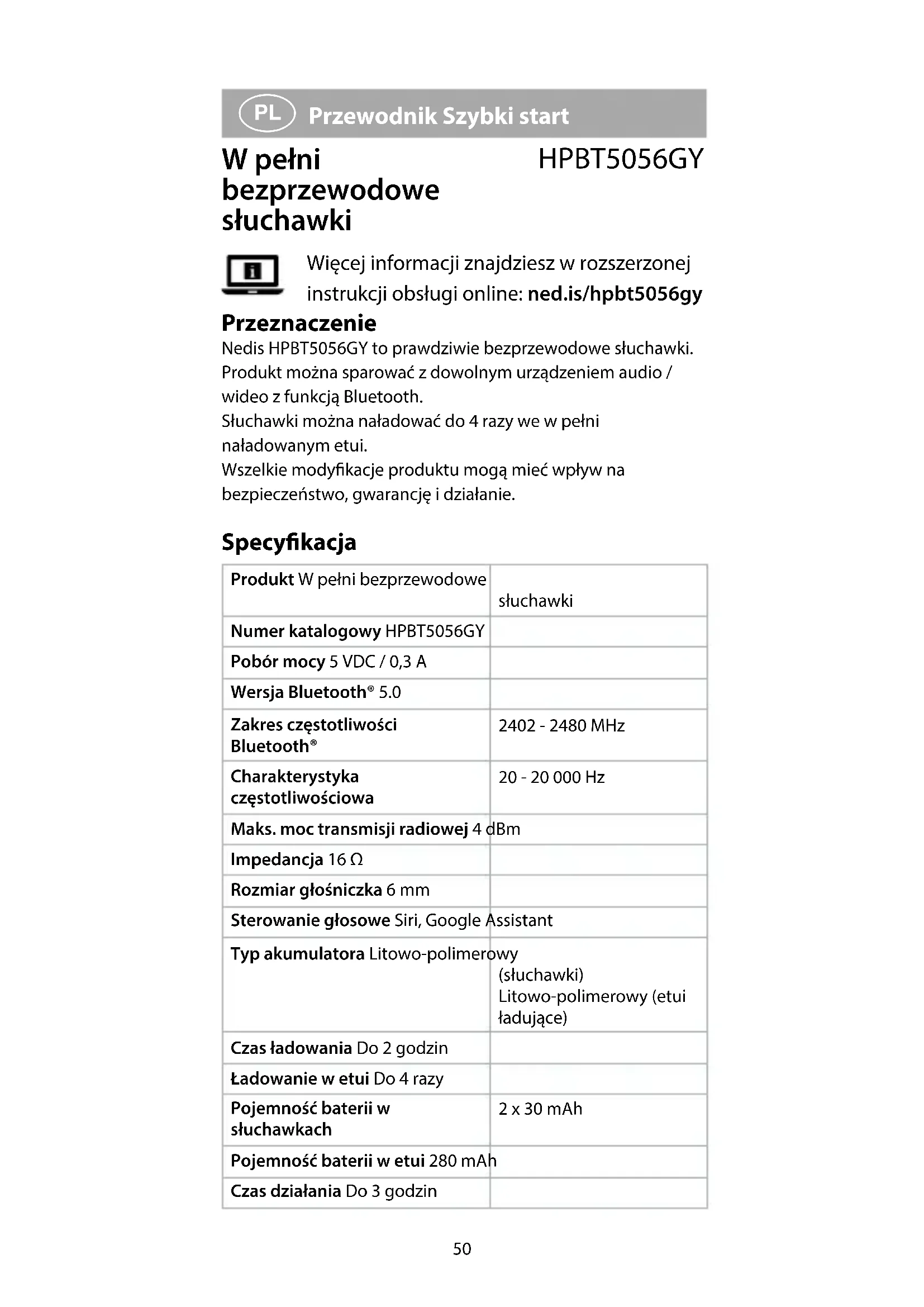 HPBT5056GY - Słuchawka NEDIS - Bezpłatna instrukcja obsługi