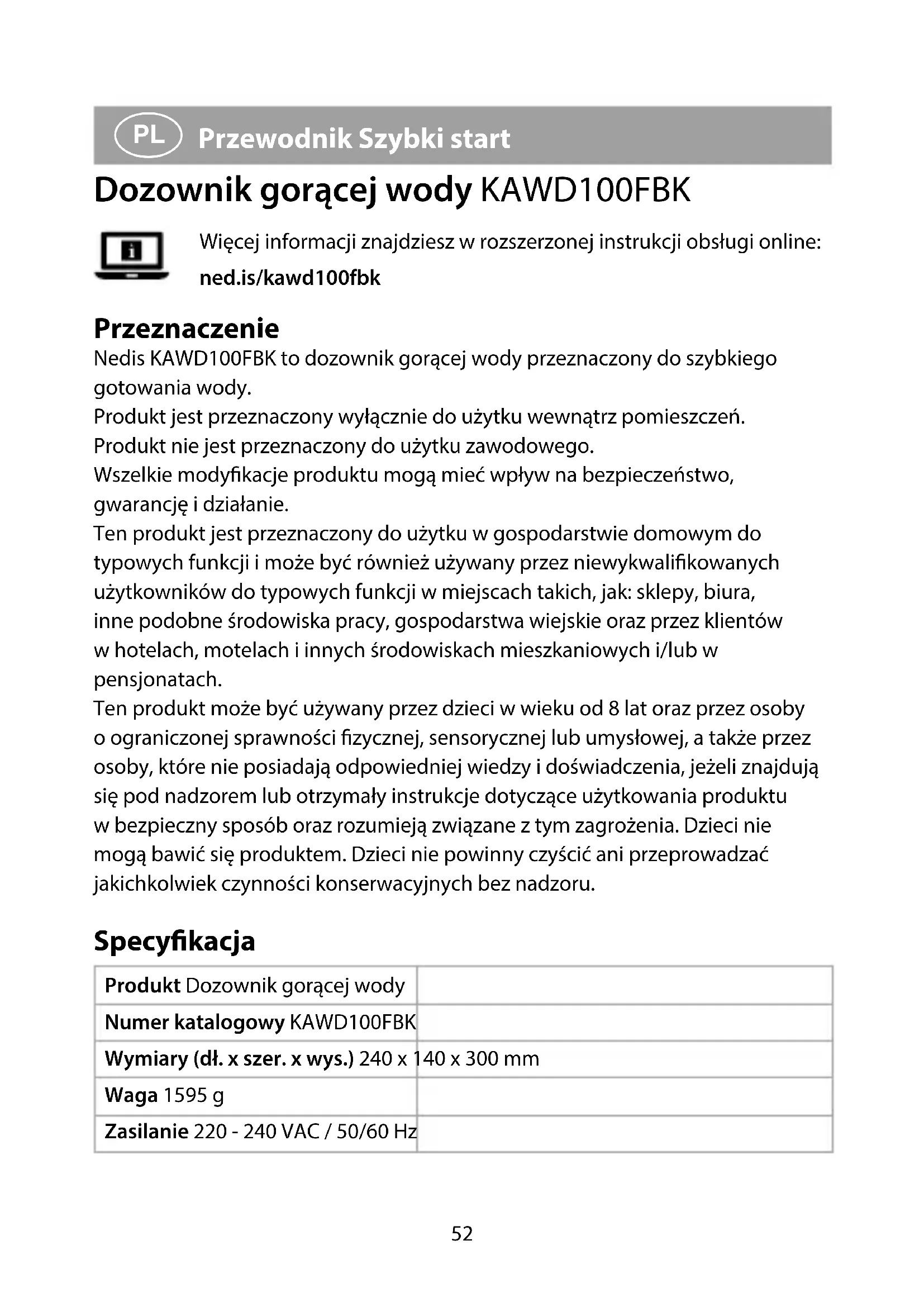 Przewodnik Szybki start Dozownik gorącej wody KAWD100FBK Więcej informacji znajdziesz w rozszerzonej instrukcji obsługi online: ned.is/kawd100fbk Przeznaczenie Nedis KAWD100FBK to dozownik gorącej wody przeznaczony do szybkiego gotowania wody. Produkt jest przeznaczony wyłącznie do użytku wewnątrz pomieszczeń. Produkt nie jest przeznaczony do użytku zawodowego. Wszelkie modykacje produktu mogą mieć wpływ na bezpieczeństwo, gwarancję i działanie. Ten produkt jest przeznaczony do użytku w gospodarstwie domowym do typowych funkcji i może być również używany przez niewykwalikowanych użytkowników do typowych funkcji w miejscach takich, jak: sklepy, biura, inne podobne środowiska pracy, gospodarstwa wiejskie oraz przez klientów w hotelach, motelach i innych środowiskach mieszkaniowych i/lub w pensjonatach. Ten produkt może być używany przez dzieci w wieku od 8 lat oraz przez osoby o ograniczonej sprawności zycznej, sensorycznej lub umysłowej, a także przez osoby, które nie posiadają odpowiedniej wiedzy i doświadczenia, jeżeli znajdują się pod nadzorem lub otrzymały instrukcje dotyczące użytkowania produktu w bezpieczny sposób oraz rozumieją związane z tym zagrożenia. Dzieci nie mogą bawić się produktem. Dzieci nie powinny czyścić ani przeprowadzać jakichkolwiek czynności konserwacyjnych bez nadzoru. Specykacja Produkt Dozownik gorącej wody Numer katalogowy KAWD100FBK Wymiary (dł. x szer. x wys.) 240 x 140 x 300 mm Waga 1595 g Zasilanie 220 - 240 VAC / 50/60 Hz KAWD100FBK_MAN_COMP_0520_print_(20161 1422)_v00.01.indd 52KAWD100FBK_MAN_COMP_0520_print_(20161 1422)_v00.01.indd 52 18-05-2020 09:0818-05-2020 09:0853 Zużycie energii 2200 - 2600 W Moc wtrybie czuwania 0,5 W Ilość wody 0,5 - 2,5 L Główne części (rysunek A)