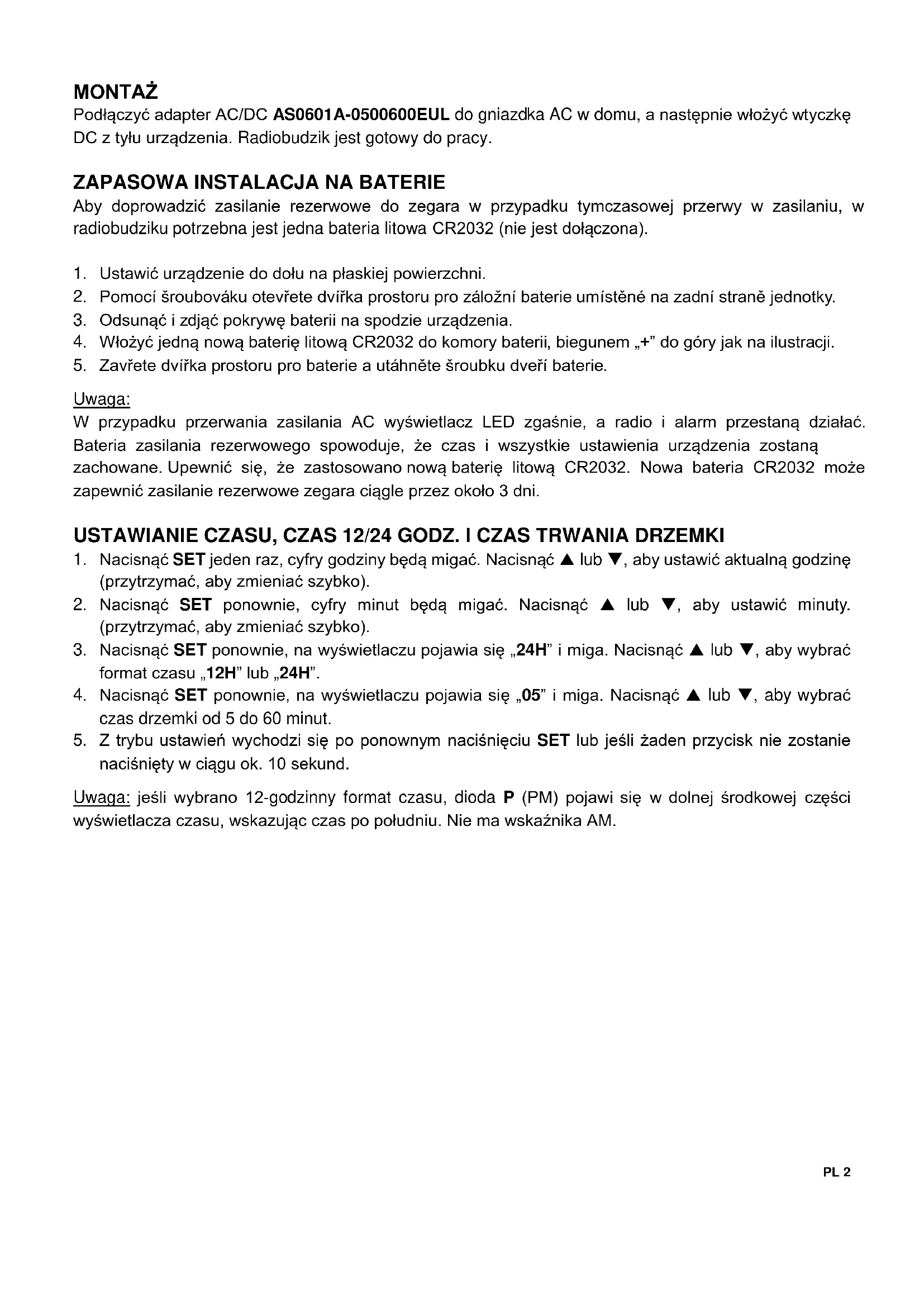 ZASILANIE DO URZĄDZENIAPL 2 MONTAŻ Podłączyć adapter AC/DC AS0601A-0500600EUL do gniazdka AC w domu, a następnie włożyć wtyczkę DC z tyłu urządzenia. Radiobudzik jest gotowy do pracy.