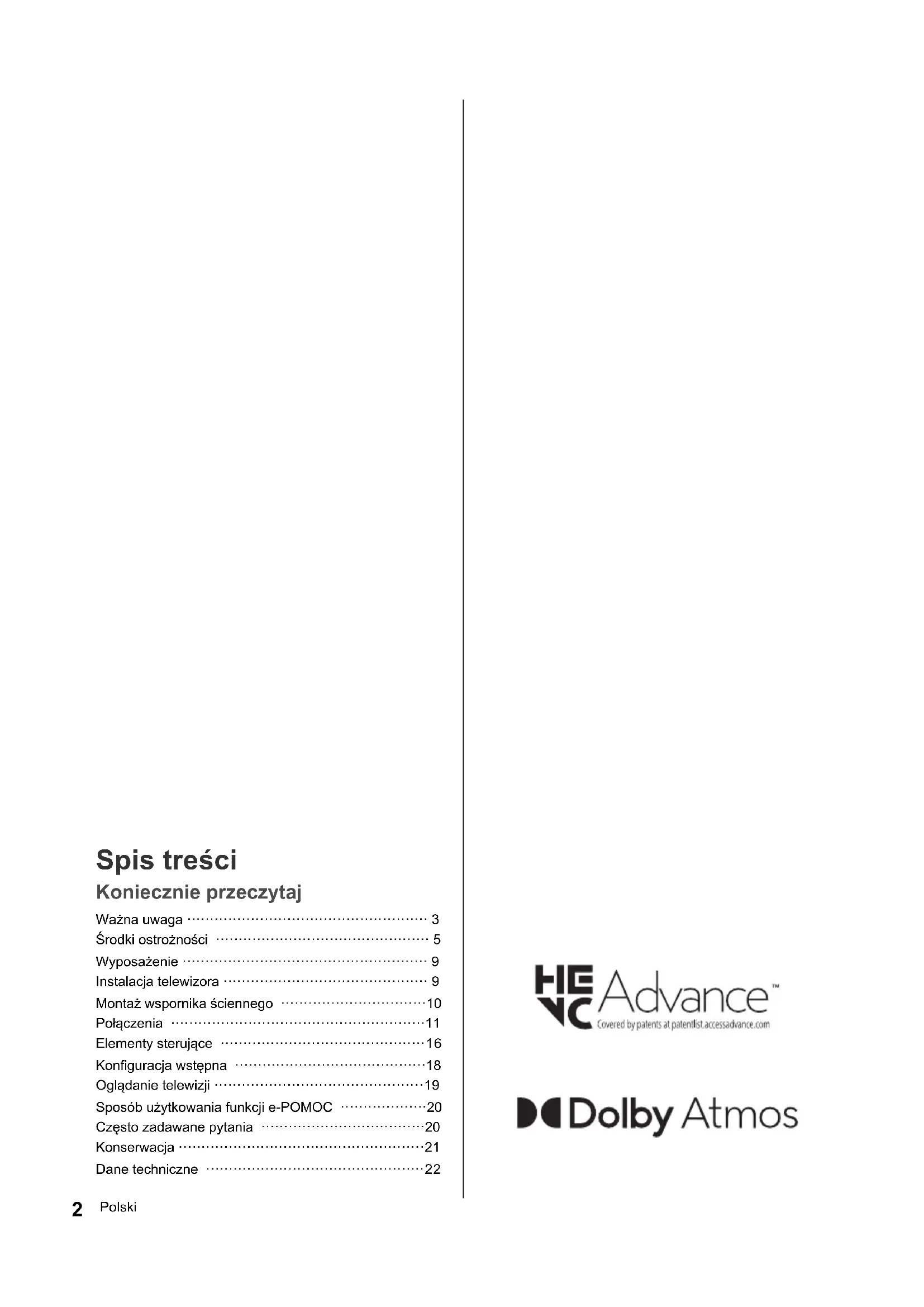 są zastrzeżonymi znakami towarowymi firmy Bluetooth SIG, Inc., a firma Panasonic Holdings Corporation używa tych znaków na mocy licencji. DVB oraz logo DVB są znakami towarowymi należącymi do DVB Project. x.v.Colour™ jest znakiem towarowym. DiSEqC™ jest znakiem towarowym firmy EUTELSAT. Google jest znakiem towarowym Google LLC. YouTube i logo YouTube są znakami towarowymi firmy Google LLC. Amazon, Prime Video i wszelkie powiązane loga są znakami towarowymi Amazon.com Inc. lub jednostek stowarzyszonych. © Disney Ten produkt spełnia wymagania danych technicznych UHD Alliance: UHDA Specified Reference Mode, Wersja 1.0. Logo FILMMAKER MODE™ jest znakiem towarowym UHD Alliance, Inc. w Stanach Zjednoczonych i innych krajach. ≥ W celu uzyskania dodatkowych informacji na temat znaków towarowych należy skorzystać z funkcji [e- POMOC] (Wyszukaj wg przeznaczenia > Najpierw przeczytaj > Przed użyciem > Licencja). Ważna uwaga Uwagi dotyczące funkcji DVB/nadawania danych/IPTV ≥ Telewizor ten został zaprojektowany, aby spełnić warunki (stan na maj, 2022 r.) dotyczące naziemnej telewizji cyfrowej DVB-T / T2 (MPEG2, MPEG4- AVC(H.264) i MPEG HEVC(H.265)), cyfrowej telewizji kablowej DVB-C (MPEG2, MPEG4-AVC(H.264) i MPEG HEVC(H.265)) oraz cyfrowej telewizji satelitarnej DVB-S (MPEG2, MPEG4-AVC(H.264) i MPEG HEVC(H.265)). Informacje na temat dostępności cyfrowej telewizji naziemnej DVB-T / T2 i satelitarnej DVB-S w danym regionie można uzyskać u lokalnego dystrybutora. Informacje na temat dostępności cyfrowej telewizji kablowej DVB-C dla tego telewizora można uzyskać u operatora telewizji kablowej. ≥ Niniejszy telewizor może nie odbierać prawidłowo sygnałów niezgodnych ze standardami DVB-T / T2, DVB-C lub DVB-S. ≥ W niektórych krajach, regionach, u niektórych nadawców, operatorów oraz w przypadku niektórych satelitów lub środowisk sieciowych pewne funkcje mogą być niedostępne. ≥ Nie wszystkie moduły CI działają prawidłowo z tym telewizorem.W celu uzyskania informacji na temat dostępnych modułów CI należy skontaktować się z operatorem. ≥ Telewizor ten może nie działać prawidłowo z modułem CI, który nie został zatwierdzony przez operatora. ≥ W zależności od operatora mogą być pobierane dodatkowe opłaty. ≥ Nie jest gwarantowana zgodność telewizora z przyszłymi usługami. Aplikacje internetowe i funkcja sterowania głosowego są udostępniane przez odpowiednich dostawców usług i mogą podlegać zmianom, przerwom w działaniu lub wycofaniu. Firma Panasonic nie ponosi odpowiedzialności i nie udziela gwarancji w zakresie dostępności lub ciągłości świadczenia usług. Firma Panasonic nie gwarantuje działania ani wydajności urządzeń peryferyjnych innych producentów. Firma Panasonic nie przyjmuje żadnej odpowiedzialności ani zobowiązań odszkodowawczych wynikających z działania i/lub wydajności takich urządzeń peryferyjnych innych producentów. O ile nie wspomniano inaczej, w podręczniku tym używana jest ilustracja modelu TX-55LX800E. Przedstawione ilustracje mogą różnić się w zależności od modelu. TX-43_50_55_65_75LX800E_72-LX800E-X32Z2_pol.book 3 ページ 2022年6月22日 水曜日 午前11時16分4 Polski Uszkodzenia ≥ Z wyjątkiem sytuacji, w których odpowiedzialność została przyznana przez przepisy lokalne, Panasonic nie ponosi odpowiedzialności za awarie produktu spowodowane nieprawidłowym użytkowaniem lub korzystaniem z niego, a także inne problemy lub uszkodzenia powstałe przy użytkowaniu produktu. ≥ Firma Panasonic nie będzie ponosić odpowiedzialności za utratę danych itp. w wyniku katastrof. ≥ Gwarancja nie obejmuje urządzeń zewnętrznych przygotowanych oddzielnie przez klienta. Dbanie o dane przechowywane na takich urządzeniach jest odpowiedzialnością klienta. Firma Panasonic nie będzie ponosiła odpowiedzialności za nadużycia takich danych. Postępowanie z danymi klienta Dane osobowe klienta mogą być rejestrowane w pamięci telewizora przez nadawców telewizyjnych lub dostawców aplikacji. Przed naprawą, przekazaniem lub pozbyciem się tego telewizora należy wymazać wszystkie zapisane w jego pamięci dane zgodnie z następującą procedurą. [e-POMOC] (Wyszukaj wg przeznaczenia > Funkcje > Resetowanie) Dane klienta mogą być gromadzone przez dostawcę za pośrednictwem aplikacji dostarczonych przez firmy zewnętrzne na tym telewizorze lub w witrynie internetowej. Prosimy z wyprzedzeniem zaakceptować warunki świadczenia usługi itp.