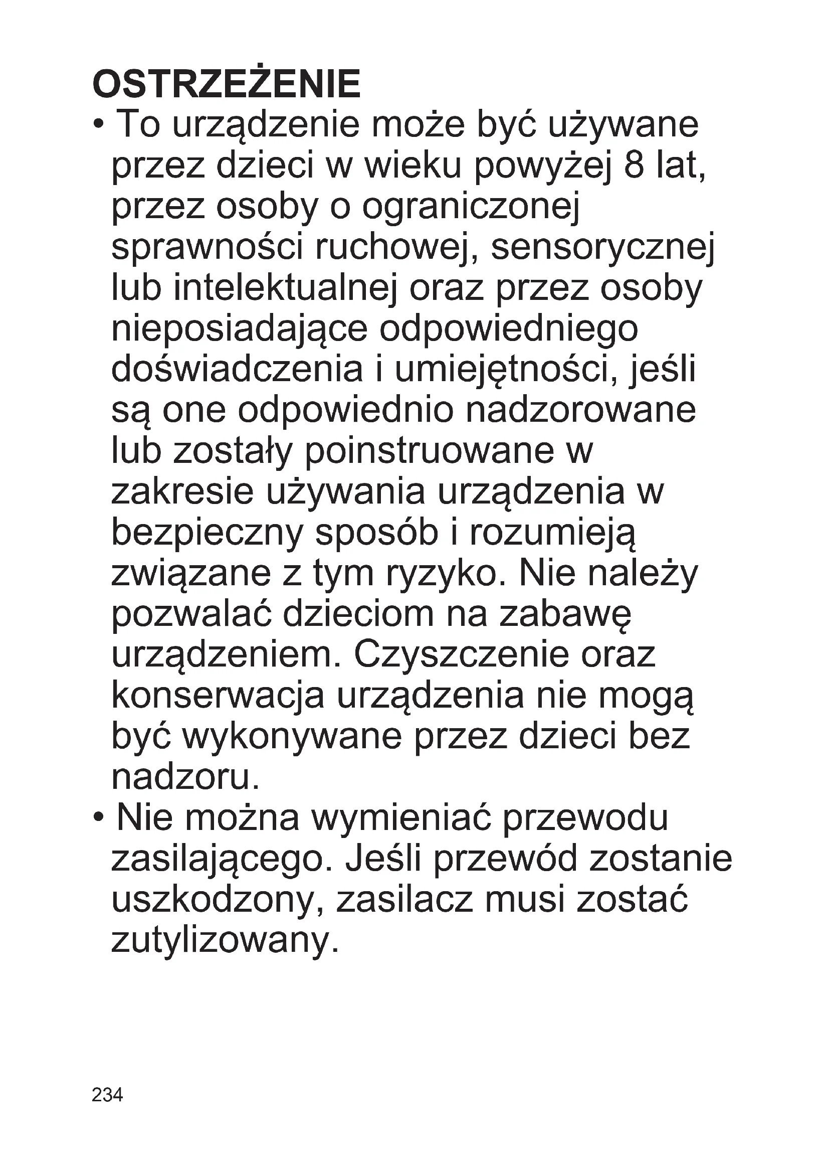 - Tourządzeniemożebyćużywane przezdzieciwwiekupowyżej8lat, przez osoby o ograniczonej sprawnościruchowej,sensorycznej lub intelektualnej oraz przez osoby nieposiadająceodpowiedniego doświadczeniaiumiejętności,jeśli sąoneodpowiednionadzorowane lubzostałypoinstruowanew zakresieużywaniaurządzeniaw bezpiecznysposóbirozumieją związaneztymryzyko.Nienależy pozwalaćdzieciomnazabawę urządzeniem.Czyszczenieoraz konserwacjaurządzenianiemogą byćwykonywaneprzezdziecibez nadzoru.