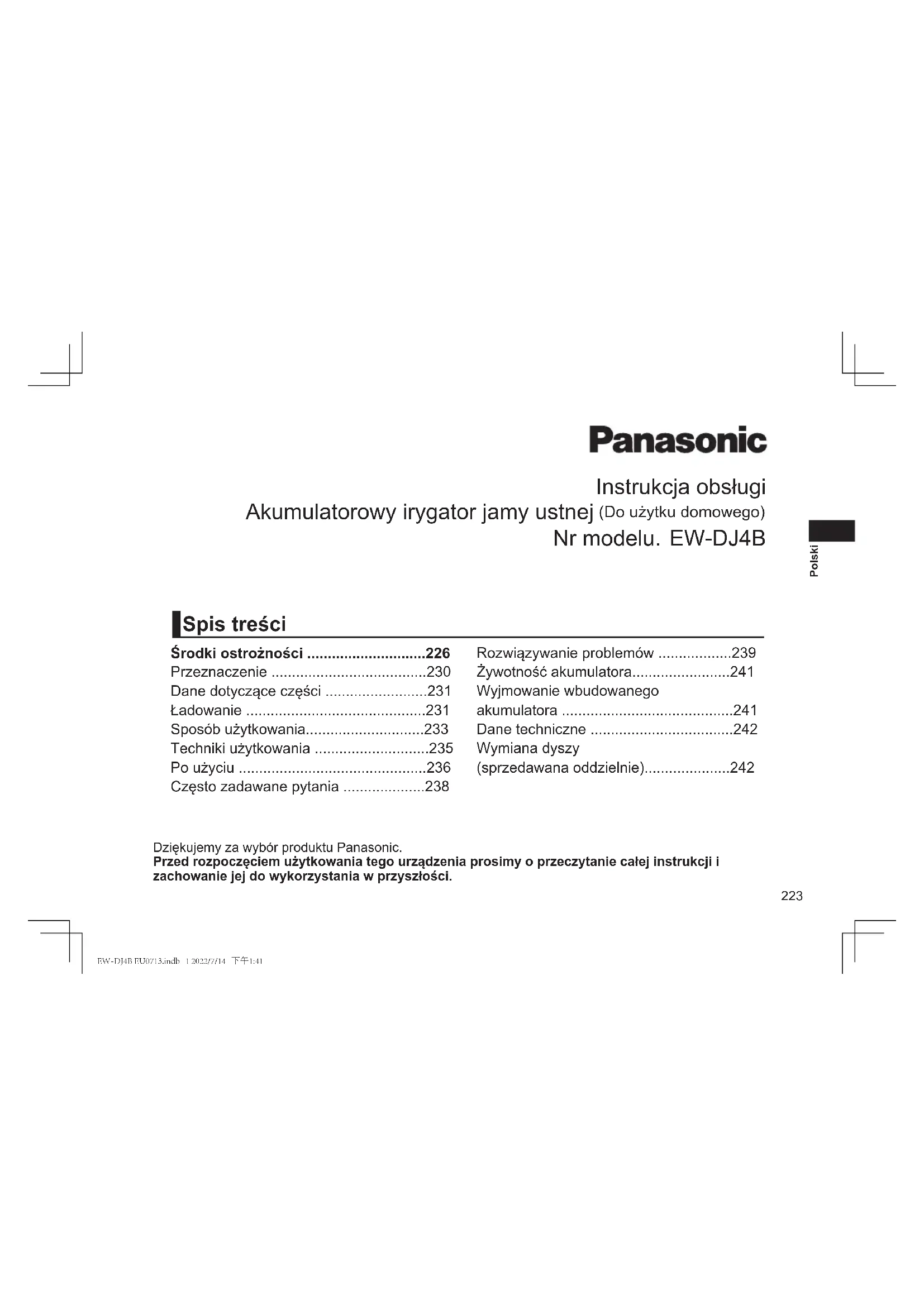 - EW-DJ4B EU0713.indb 20 2022/7/14 下午1:41223 Polski Dziękujemy za wybór produktu Panasonic.Przed rozpoczęciem użytkowania tego urządzenia prosimy o przeczytanie całej instrukcji i zachowanie jej do wykorzystania w przyszłości. Spis treści Instrukcja obsługi Akumulatorowy irygator jamy ustnej (Do użytku domowego) Nr modelu. EW-DJ4B Środki ostrożności p. 226