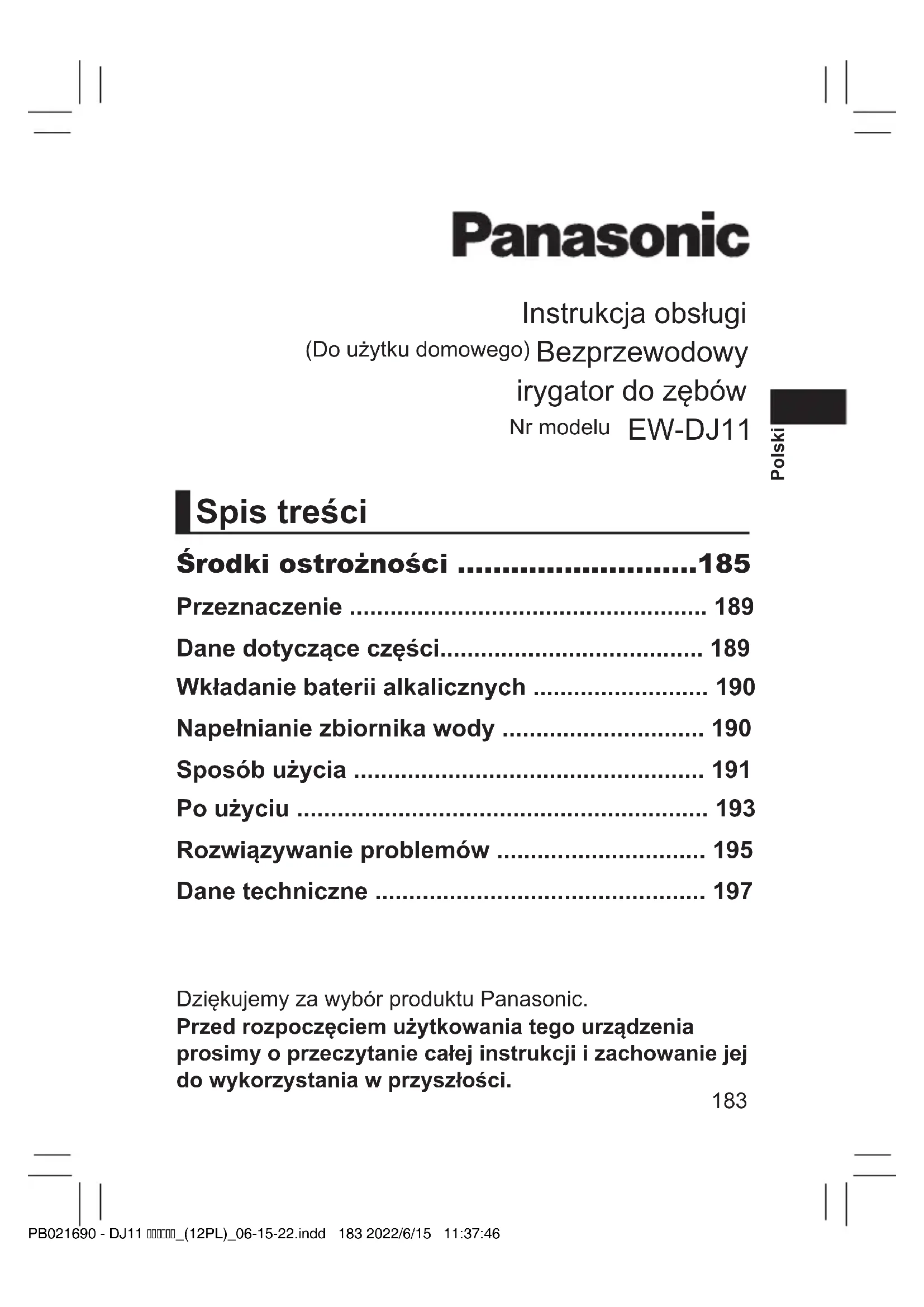 - Dopchnij PB021690 - DJ11 _(12PL)_06-15-22.indd 196 2022/6/15 11:37:48197 Polski Dane techniczne Zasilanie Bateria alkaliczna Bateria Dwie LR6 (baterie alkaliczne AA ) (sprzedawane oddzielnie) Czas pracy Około 20 min (gdy korzystasz z dwóch baterii LR6 rmy Panasonic (alkalicznych AA), poziom ciśnienia wody wynosi 2, a temperatura w pomieszczeniu 20 °C) Pojemność zbiornika Ok. 150 mL (Przez około 35 sek. Pracy, kiedy poziom ciśnienia wody jest ustawiony na 2) Wymiary Ok. 30,9 cm (lub 23,4 cm w przypadku niezainstalowanej dyszy) (wys.) x 5,2 cm (szer.) x 5,7 cm (głęb.) Po złożeniu: Ok. 15,4 cm (wys.) x 5,2 cm (szer.) x 5,7 cm (głęb.) Poziom hałasu 72 (dB (A) re 1 pW) Produkt przeznaczony wyłącznie do użytku domowego. PB021690 - DJ11 _(12PL)_06-15-22.indd 197 2022/6/15 11:37:48198 Polski Pozbywanie się zużytych urządzeń elektrycznych i elektronicznych. Dotyczy wyłącznie obszaru Unii Europejskiej oraz krajów posiadających systemy zbiórki i recyklingu. Niniejszy symbol umieszczony na produktach, opakowaniach i/lub w dokumentacji towarzyszącej oznacza, że nie wolno mieszać zużytych urządzeń elektrycznych i elektronicznych z innymi odpadami domowymi/komunalnymi. W celu zapewnienia właściwego przetwarzania, utylizacji oraz recyklingu zużytych urządzeń elektrycznych i elektronicznych, należy oddawać je do wyznaczonych punktów gromadzenia odpadów zgodnie z przepisami prawa krajowego. Poprzez prawidłowe pozbywanie się zużytych urządzeń elektrycznych i elektronicznych pomagasz oszczędzać cenne zasoby naturalne oraz zapobiegać potencjalnemu negatywnemu wpływowi na zdrowie człowieka oraz na stan środowiska naturalnego. W celu uzyskania informacji o zbiórce oraz recyklingu zużytych urządzeń elektrycznych i elektronicznych prosimy o kontakt z władzami lokalnymi. Za niewłaściwe pozbywanie się tych odpadów mogą grozić kary przewidziane przepisami prawa krajowego. Importer: Panasonic Marketing Europe GmbH Upoważniony przedstawiciel w UE: Panasonic Testing Centre Winsbergring 15, 22525 Hamburg, Niemcy Wyprodukowano przez: Panasonic Corporation 1006, Oaza Kadoma, Kadoma City, Osaka, Japonia PB021690 - DJ11 _(12PL)_06-15-22.indd 198 2022/6/15 11:37:48199 Česky Děkujeme vám za zakoupení tohoto výrobku Panasonic. Před zahájením provozu tohoto spotřebiče si přečtěte všechny tyto pokyny a uložte je pro budoucí použití. Návod k obsluze (Pro domácí použití) Přenosná ústní sprcha Model EW-DJ11 Obsah Bezpečnostní opatření p. 201