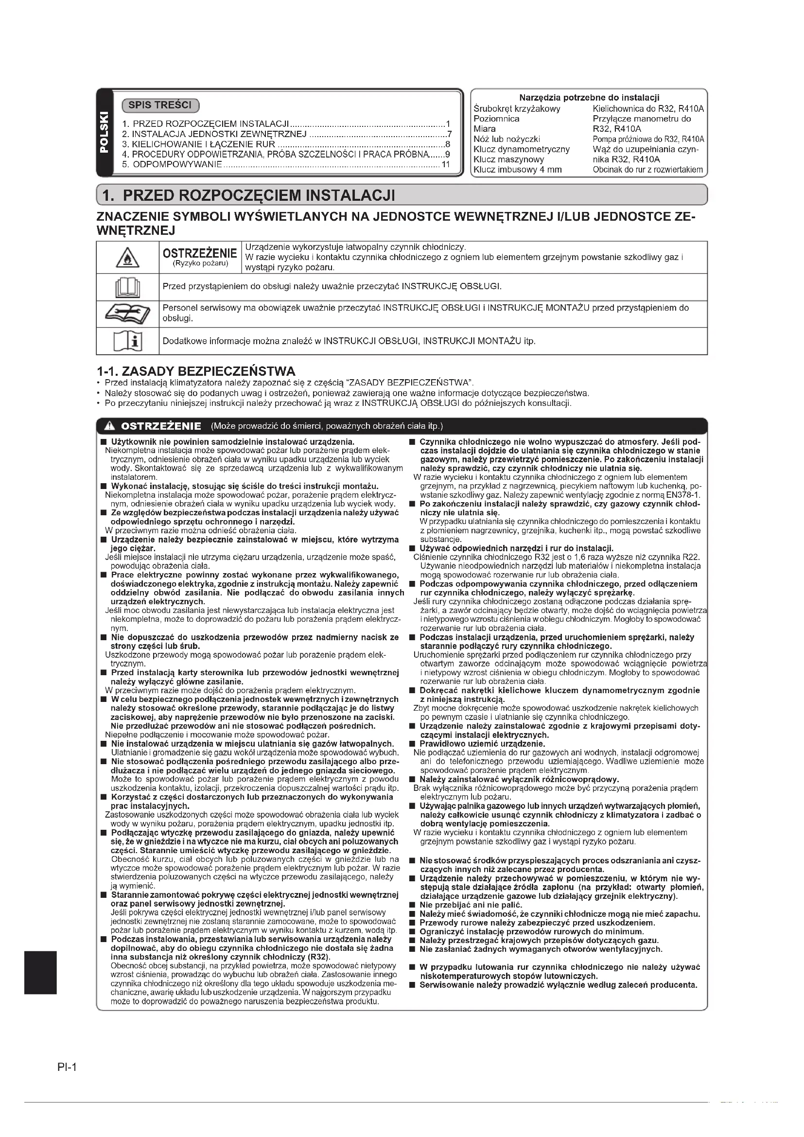 ■ Użytkownik nie powinien samodzielnie instalować urządzenia. Niekompletna instalacja może spowodować pożar lub porażenie prądem elek-trycznym, odniesienie obrażeń ciała w wyniku upadku urządzenia lub wyciek wody. Skontaktować się ze sprzedawcą urządzenia lub z wykwalikowanym instalatorem.■ Wykonać instalację, stosując się ściśle do treści instrukcji montażu. Niekompletna instalacja może spowodować pożar, porażenie prądem elektrycz-nym, odniesienie obrażeń ciała w wyniku upadku urządzenia lub wyciek wody. ■ Ze względów bezpieczeństwa podczas instalacji urządzenia należy używać odpowiedniego sprzętu ochronnego i narzędzi. W przeciwnym razie można odnieść obrażenia ciała. ■ Urządzenie należy bezpiecznie zainstalować w miejscu, które wytrzyma jego ciężar. Jeśli miejsce instalacji nie utrzyma ciężaru urządzenia, urządzenie może spaść, powodując obrażenia ciała. ■ Prace elektryczne powinny zostać wykonane przez wykwalikowanego, doświadczonego elektryka, zgodnie z instrukcją montażu. Należy zapewnić oddzielny obwód zasilania. Nie podłączać do obwodu zasilania innych urządzeń elektrycznych. Jeśli moc obwodu zasilania jest niewystarczająca lub instalacja elektryczna jest niekompletna, może to doprowadzić do pożaru lub porażenia prądem elektrycz- nym. ■ Nie dopuszczać do uszkodzenia przewodów przez nadmierny nacisk ze strony części lub śrub. Uszkodzone przewody mogą spowodować pożar lub porażenie prądem elek-trycznym. ■ Przed instalacją karty sterownika lub przewodów jednostki wewnętrznej należy wyłączyć główne zasilanie. W przeciwnym razie może dojść do porażenia prądem elektrycznym. ■ W celu bezpiecznego podłączenia jednostek wewnętrznych i zewnętrznych należy stosować określone przewody, starannie podłączając je do listwy zaciskowej, aby naprężenie przewodów nie było przenoszone na zaciski. Nie przedłużać przewodów ani nie stosować podłączeń pośrednich. Niepełne podłączenie i mocowanie może spowodować pożar. ■ Nie instalować urządzenia w miejscu ulatniania się gazów łatwopalnych. Ulatnianie i gromadzenie się gazu wokół urządzenia może spowodować wybuch. ■ Nie stosować podłączenia pośredniego przewodu zasilającego albo prze- dłużacza i nie podłączać wielu urządzeń do jednego gniazda sieciowego. Może to spowodować pożar lub porażenie prądem elektrycznym z powodu uszkodzenia kontaktu, izolacji, przekroczenia dopuszczalnej wartości prądu itp.■ Korzystać z części dostarczonych lub przeznaczonych do wykonywania prac instalacyjnych. Zastosowanie uszkodzonych części może spowodować obrażenia ciała lub wyciek wody w wyniku pożaru, porażenia prądem elektrycznym, upadku jednostki itp.■ Podłączając wtyczkę przewodu zasilającego do gniazda, należy upewnić się, że w gnieździe i na wtyczce nie ma kurzu, ciał obcych ani poluzowanych części. Starannie umieścić wtyczkę przewodu zasilającego w gnieździe. Obecność kurzu, ciał obcych lub poluzowanych części w gnieździe lub na wtyczce może spowodować porażenie prądem elektrycznym lub pożar. W razie stwierdzenia poluzowanych części na wtyczce przewodu zasilającego, należy ją wymienić. ■ Starannie zamontować pokrywę części elektrycznej jednostki wewnętrznej oraz panel serwisowy jednostki zewnętrznej. Jeśli pokrywa części elektrycznej jednostki wewnętrznej i/lub panel serwisowy jednostki zewnętrznej nie zostaną starannie zamocowane, może to spowodować pożar lub porażenie prądem elektrycznym w wyniku kontaktu z kurzem, wodą itp. ■ Podczas instalowania, przestawiania lub serwisowania urządzenia należy dopilnować, aby do obiegu czynnika chłodniczego nie dostała się żadna inna substancja niż określony czynnik chłodniczy (R32). Obecność obcej substancji, na przykład powietrza, może spowodować nietypowy wzrost ciśnienia, prowadząc do wybuchu lub obrażeń ciała. Zastosowanie innego czynnika chłodniczego niż określony dla tego układu spowoduje uszkodzenia me- chaniczne, awarię układu lub uszkodzenie urządzenia. W najgorszym przypadku może to doprowadzić do poważnego naruszenia bezpieczeństwa produktu. ■ Czynnika chłodniczego nie wolno wypuszczać do atmosfery. Jeśli pod- czas instalacji dojdzie do ulatniania się czynnika chłodniczego w stanie gazowym, należy przewietrzyć pomieszczenie. Po zakończeniu instalacji należy sprawdzić, czy czynnik chłodniczy nie ulatnia się. W razie wycieku i kontaktu czynnika chłodniczego z ogniem lub elementem grzejnym, na przykład z nagrzewnicą, piecykiem naftowym lub kuchenką, po- wstanie szkodliwy gaz. Należy zapewnić wentylację zgodnie z normą EN378-1. ■ Po zakończeniu instalacji należy sprawdzić, czy gazowy czynnik chłod- niczy nie ulatnia się. W przypadku ulatniania się czynnika chłodniczego do pomieszczenia i kontaktu z płomieniem nagrzewnicy, grzejnika, kuchenki itp., mogą powstać szkodliwe substancje.■ Używać odpowiednich narzędzi i rur do instalacji. Ciśnienie czynnika chłodniczego R32 jest o 1,6 raza wyższe niż czynnika R22. Używanie nieodpowiednich narzędzi lub materiałów i niekompletna instalacja mogą spowodować rozerwanie rur lub obrażenia ciała. ■ Podczas odpompowywania czynnika chłodniczego, przed odłączeniem rur czynnika chłodniczego, należy wyłączyć sprężarkę. Jeśli rury czynnika chłodniczego zostaną odłączone podczas działania sprę-żarki, a zawór odcinający będzie otwarty, może dojść do wciągnięcia powietrza i nietypowego wzrostu ciśnienia w obiegu chłodniczym. Mogłoby to spowodować rozerwanie rur lub obrażenia ciała. ■ Podczas instalacji urządzenia, przed uruchomieniem sprężarki, należy starannie podłączyć rury czynnika chłodniczego. Uruchomienie sprężarki przed podłączeniem rur czynnika chłodniczego przy otwartym zaworze odcinającym może spowo
