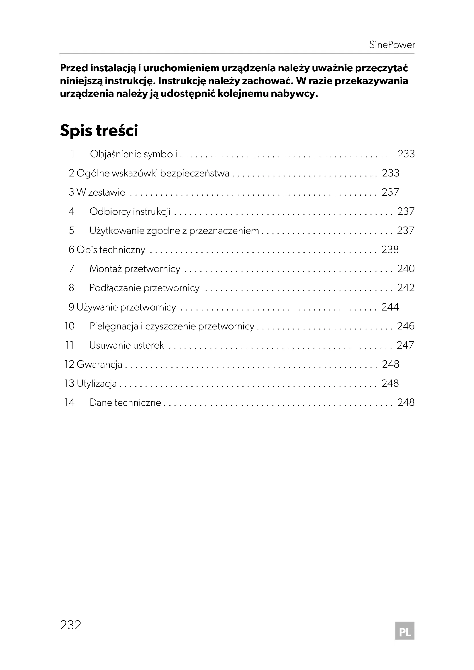 - Przed instalacją i uruchomieniem urządzenia należy uważnie przeczytać niniejszą instrukcję. Instrukcję należy zachować. W razie przekazywania urządzenia należy ją udostępnić kolejnemu nabywcy. Spis treści 1 Objaśnienie symboli p. 233