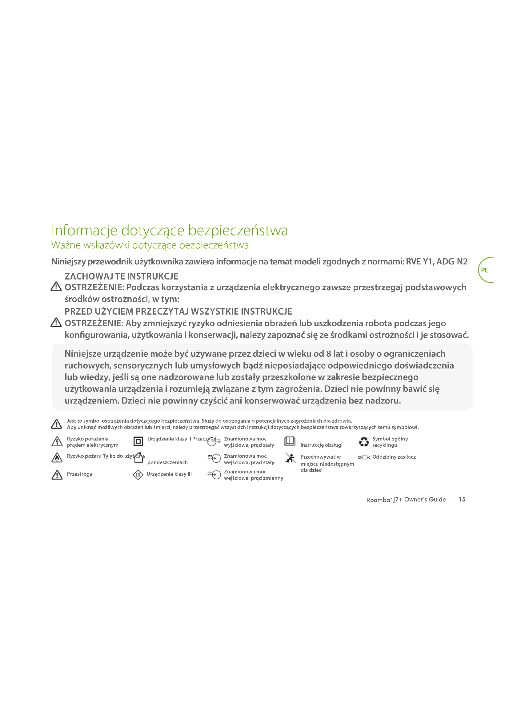 Ryzyko porażenia prądem elektrycznymUrządzenie klasy II Przeczytaj instrukcję obsługiRyzyko pożaru Tylko do użytku w pomieszczeniachPrzechowywać w miejscu niedostępnym dla dzieciSymbol ogólny recyklinguZnamionowa moc wejściowa, prąd stałyZnamionowa moc wyjściowa, prąd stałyOddzielny zasilacz Niniejszy przewodnik użytkownika zawiera informacje na temat modeli zgodnych z normami: RVE-Y1, ADG-N2 PrzestrogaZnamionowa moc wejściowa, prąd zmiennyUrządzenie klasy IIIPL