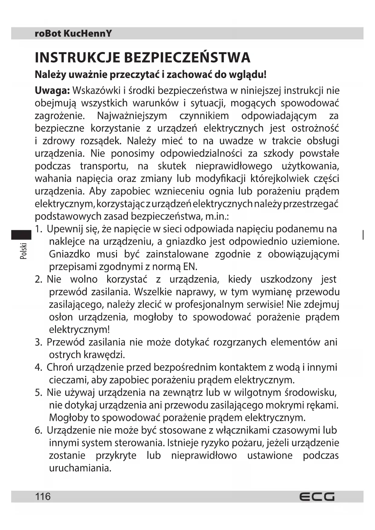 Należy uważnie przeczytać i zachować do wglądu! Uwaga: Wskazówki i środki bezpieczeństwa w niniejszej instrukcji nie obejmują wszystkich warunków i sytuacji, mogących spowodować zagrożenie. Najważniejszym czynnikiem odpowiadającym za bezpieczne korzystanie z urządzeń elektrycznych jest ostrożność i zdrowy rozsądek. Należy mieć to na uwadze w trakcie obsługi urządzenia. Nie ponosimy odpowiedzialności za szkody powstałe podczas transportu, na skutek nieprawidłowego użytkowania, wahania napięcia oraz zmiany lub modykacji którejkolwiek części urządzenia. Aby zapobiec wznieceniu ognia lub porażeniu prądem elektrycznym, korzystając z urządzeń elektrycznych należy przestrzegać podstawowych zasad bezpieczeństwa, m.in.: