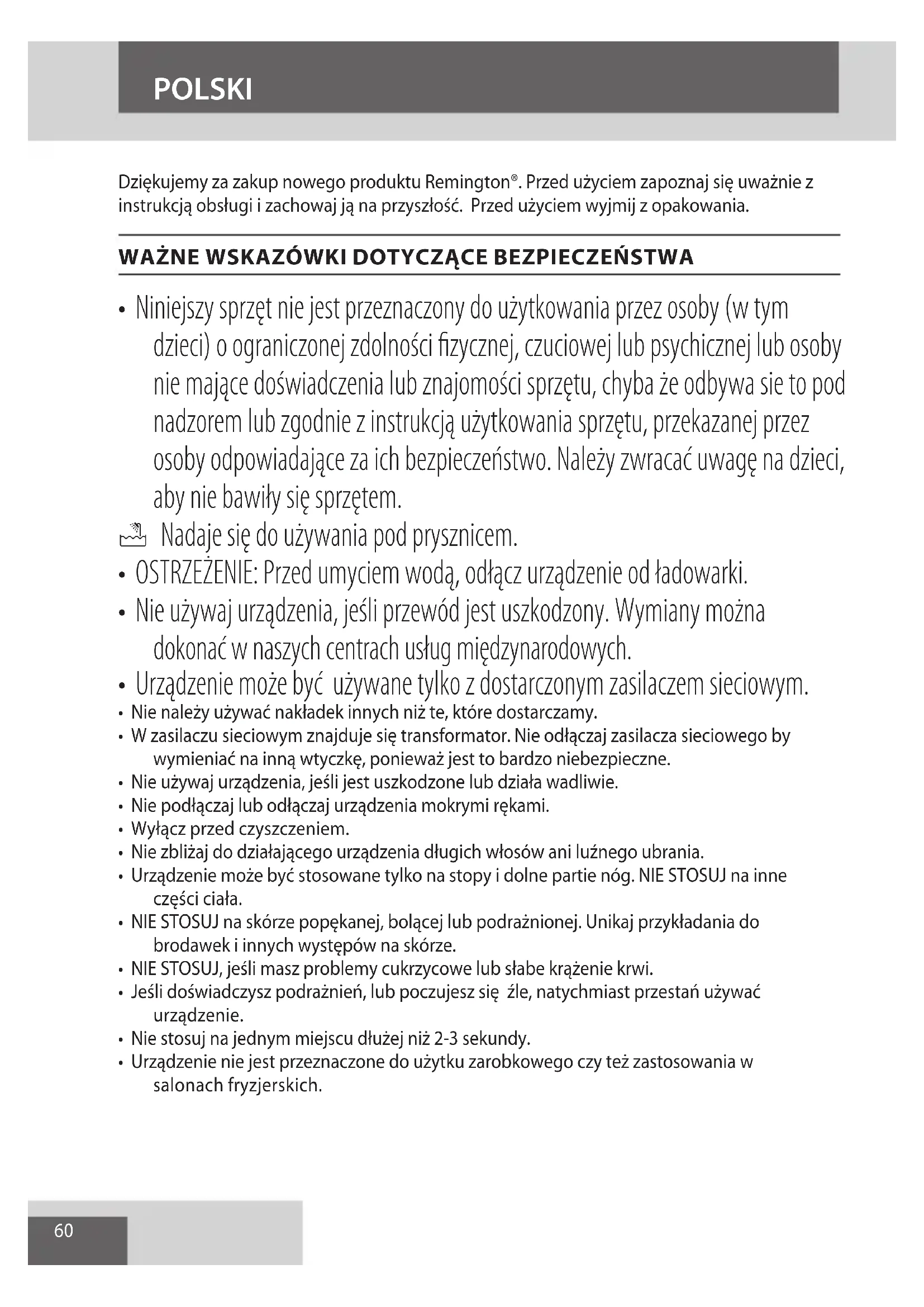 AE60 Dziękujemy za zakup nowego produktu Remington®. Przed użyciem zapoznaj się uważnie z instrukcją obsługi i zachowaj ją na przyszłość. Przed użyciem wyjmij z opakowania. WAŻNE WSKAZÓWKI DOTYCZĄCE BEZPIECZEŃSTWA