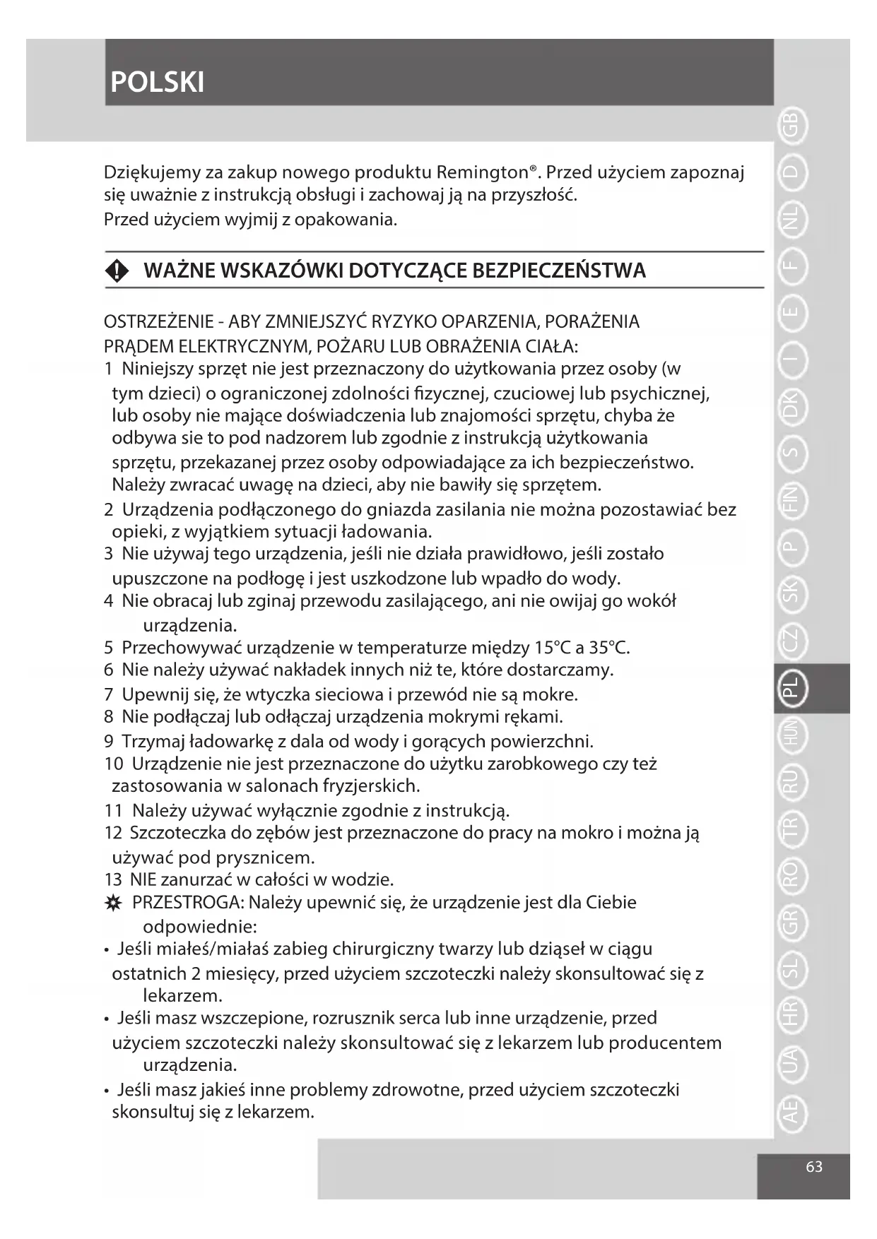 Aby nedošlo k ohrožení životního prostředí a zdraví vlivem nebezpečných látek obsažených v elektrických a elektronických produktech, nesmějí být přístroje označené tímto symbolem likvidovány jako směsný odpad, ale je nutno je třídit, znovu použít nebo recyklovat. ČESKY63 Dziękujemy za zakup nowego produktu Remington®. Przed użyciem zapoznaj się uważnie z instrukcją obsługi i zachowaj ją na przyszłość. Przed użyciem wyjmij z opakowania. F WAŻNE WSKAZÓWKI DOTYCZĄCE BEZPIECZEŃSTWA OSTRZEŻENIE - ABY ZMNIEJSZYĆ RYZYKO OPARZENIA, PORAŻENIA PRĄDEM ELEKTRYCZNYM, POŻARU LUB OBRAŻENIA CIAŁA: 1 Niniejszy sprzęt nie jest przeznaczony do użytkowania przez osoby (w tym dzieci) o ograniczonej zdolności zycznej, czuciowej lub psychicznej, lub osoby nie mające doświadczenia lub znajomości sprzętu, chyba że odbywa sie to pod nadzorem lub zgodnie z instrukcją użytkowania sprzętu, przekazanej przez osoby odpowiadające za ich bezpieczeństwo. Należy zwracać uwagę na dzieci, aby nie bawiły się sprzętem. 2 Urządzenia podłączonego do gniazda zasilania nie można pozostawiać bez opieki, z wyjątkiem sytuacji ładowania. 3 Nie używaj tego urządzenia, jeśli nie działa prawidłowo, jeśli zostało upuszczone na podłogę i jest uszkodzone lub wpadło do wody. 4 Nie obracaj lub zginaj przewodu zasilającego, ani nie owijaj go wokół urządzenia. 5 Przechowywać urządzenie w temperaturze między 15°C a 35°C. 6 Nie należy używać nakładek innych niż te, które dostarczamy. 7 Upewnij się, że wtyczka sieciowa i przewód nie są mokre. 8 Nie podłączaj lub odłączaj urządzenia mokrymi rękami. 9 Trzymaj ładowarkę z dala od wody i gorących powierzchni. 10 Urządzenie nie jest przeznaczone do użytku zarobkowego czy też zastosowania w salonach fryzjerskich. 11 Należy używać wyłącznie zgodnie z instrukcją. 12 Szczoteczka do zębów jest przeznaczone do pracy na mokro i można ją używać pod prysznicem. 13 NIE zanurzać w całości w wodzie. , PRZESTROGA: Należy upewnić się, że urządzenie jest dla Ciebie odpowiednie:
