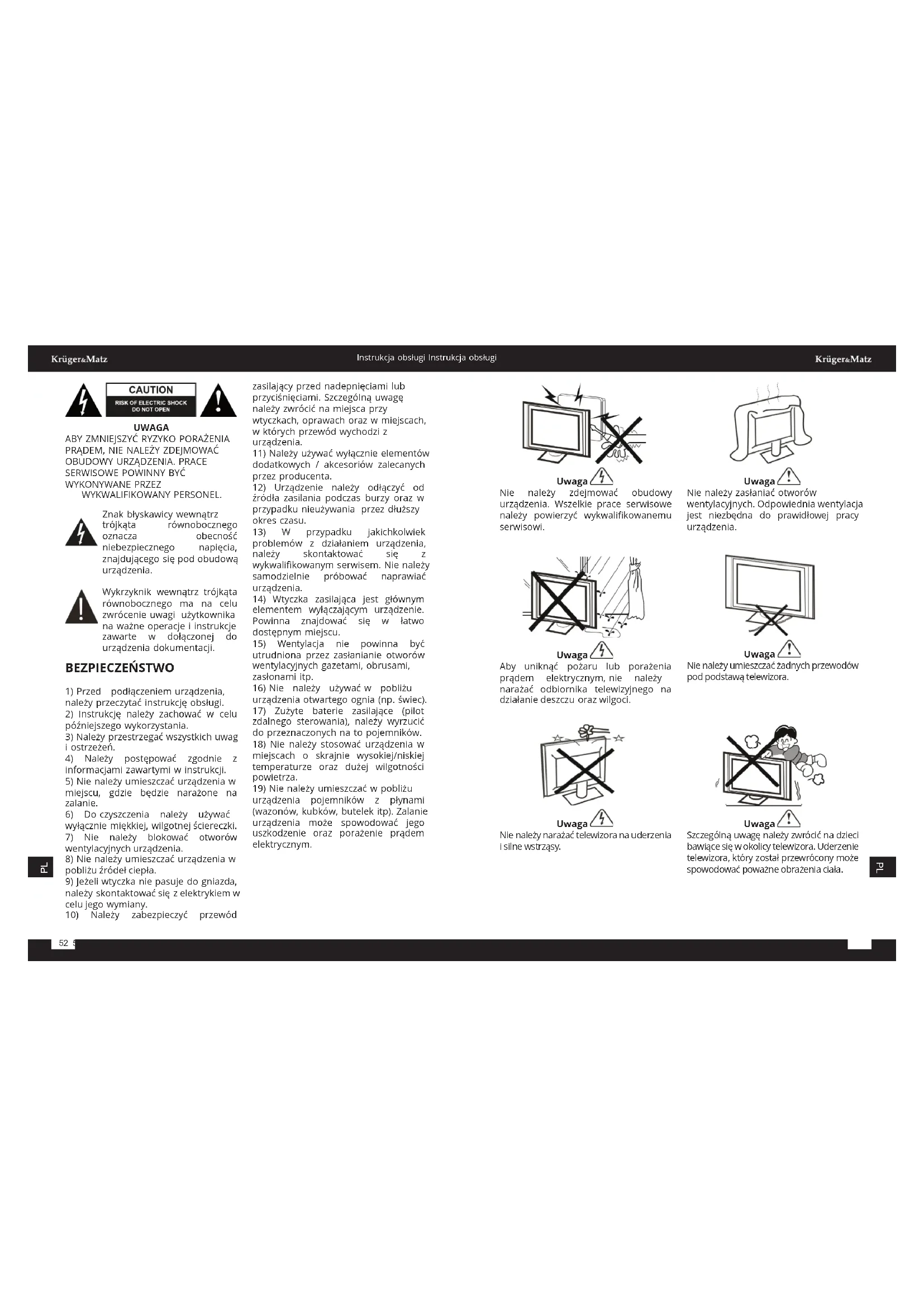 Uwaga Nie należy zdejmować obudowy urządzenia. Wszelkie prace serwisowe należy powierzyć wykwalikowanemu serwisowi. Uwaga Nie należy zasłaniać otworów wentylacyjnych. Odpowiednia wentylacja jest niezbędna do prawidłowej pracy urządzenia. Uwaga Aby uniknąć pożaru lub porażenia prądem elektrycznym, nie należy narażać odbiornika telewizyjnego na działanie deszczu oraz wilgoci. Uwaga Nie należy narażać telewizora na uderzenia i silne wstrząsy. Uwaga Nie należyumieszczać żadnych przewodów pod podstawą telewizora. Uwaga Szczególną uwagę należy zwrócić na dzieci bawiącesię w okolicy telewizora. Uderzenie telewizora, który został przewrócony może spowodować poważne obrażenia ciała.54 55 Instrukcja obsługi Instrukcja obsługi