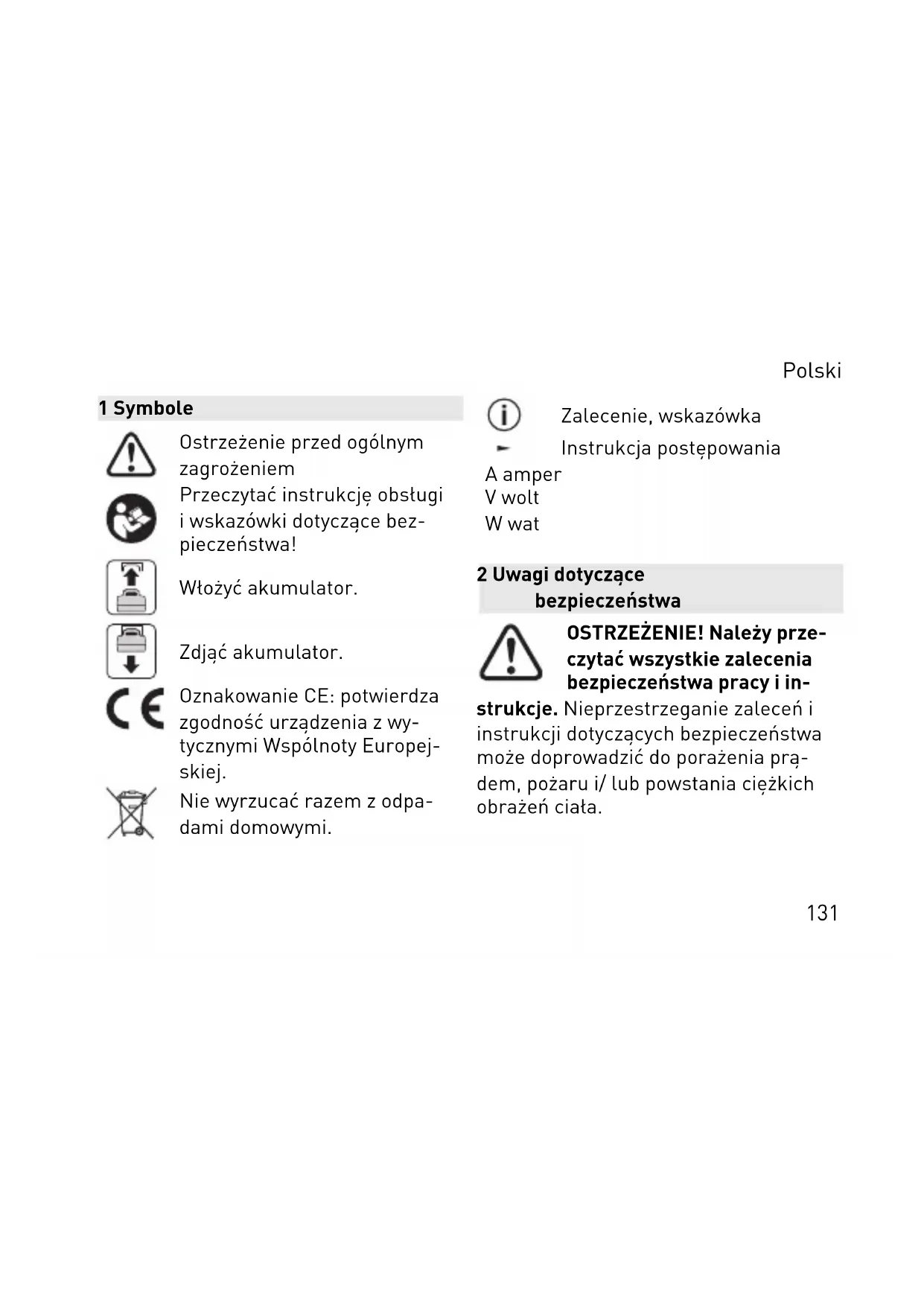 ► Om schade te verhinderen het appa raat met een droge zachte doek rei nigen. Geen oplosmiddelen gebrui ken. Nederlands 1299 Milieu Geef het apparaat niet met het huisvuil mee! Voer de apparaten, accessoires en verpakkingen op milieu vriendelijke wijze af. Neem de geldende nationale voorschriften in acht. Alleen EU: Volgens de Europese richt lijn inzake gebruikte elektrische en elektronische apparaten en de omzet ting hiervan in de nationale wetgeving dienen oude elektrische apparaten ge scheiden te worden ingezameld en op milieuvriendelijke wijze te worden afge voerd. Informatie voor REACH: www.fes tool.com/reach Nederlands 1301 Symbole Ostrzeżenie przed ogólnym zagrożeniem Przeczytać instrukcję obsługi i wskazówki dotyczące bez pieczeństwa! Włożyć akumulator. Zdjąć akumulator. Oznakowanie CE: potwierdza zgodność urządzenia z wy tycznymi Wspólnoty Europej skiej. Nie wyrzucać razem z odpa dami domowymi. Zalecenie, wskazówka Instrukcja postępowania A amper V wolt W wat 2 Uwagi dotyczące bezpieczeństwa OSTRZEŻENIE! Należy prze czytać wszystkie zalecenia bezpieczeństwa pracy i in strukcje. Nieprzestrzeganie zaleceń i instrukcji dotyczących bezpieczeństwa może doprowadzić do porażenia prą dem, pożaru i/ lub powstania ciężkich obrażeń ciała. Polski 131Wszystkie zalecenia i instrukcje doty czące bezpieczeństwa należy zachować do wykorzystania w przyszłości. Należy przestrzegać instrukcji obsługi akumulatora. – Nie używać urządzenia w deszczu lub w wilgotnym otoczeniu. Wilgoć wew nątrz urządzenia może spowodować zwarcie lub pożar. – Do gniazda USB nie należy wkładać gwoździ, drutu ani podobnych przed miotów. W przeciwnym razie może wystąpić zwarcie, dym lub pożar. – Nie należy podłączać gniazd USB do modułu gniazda wtykowego, innego źródła zasilania lub urządzenia o wy sokim napięciu. W przeciwnym razie istnieje zagrożenie pożarowe. Gniazda USB są przeznaczone wyłącznie do ła dowania urządzeń niskiego napięcia (wyjście USB-A = 5 V / 2,4 A; wyjście kompatybilne z USB‑C
