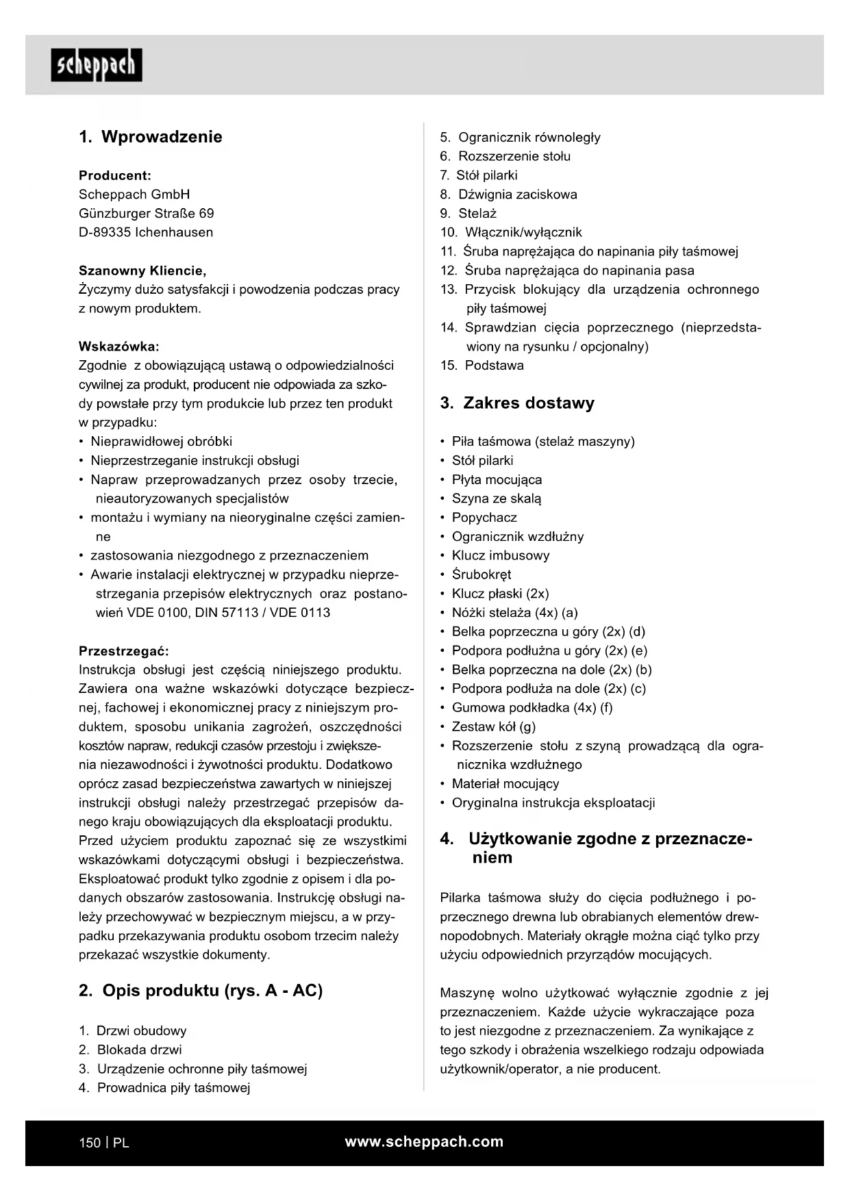 Producent: Scheppach GmbH Günzburger Straße 69 D-89335 Ichenhausen Szanowny Kliencie, Życzymy dużo satysfakcji i powodzenia podczas pracy z nowym produktem. Wskazówka: Zgodnie z obowiązującą ustawą o odpowiedzialności cywilnej za produkt, producent nie odpowiada za szko- dy powstałe przy tym produkcie lub przez ten produkt w przypadku: