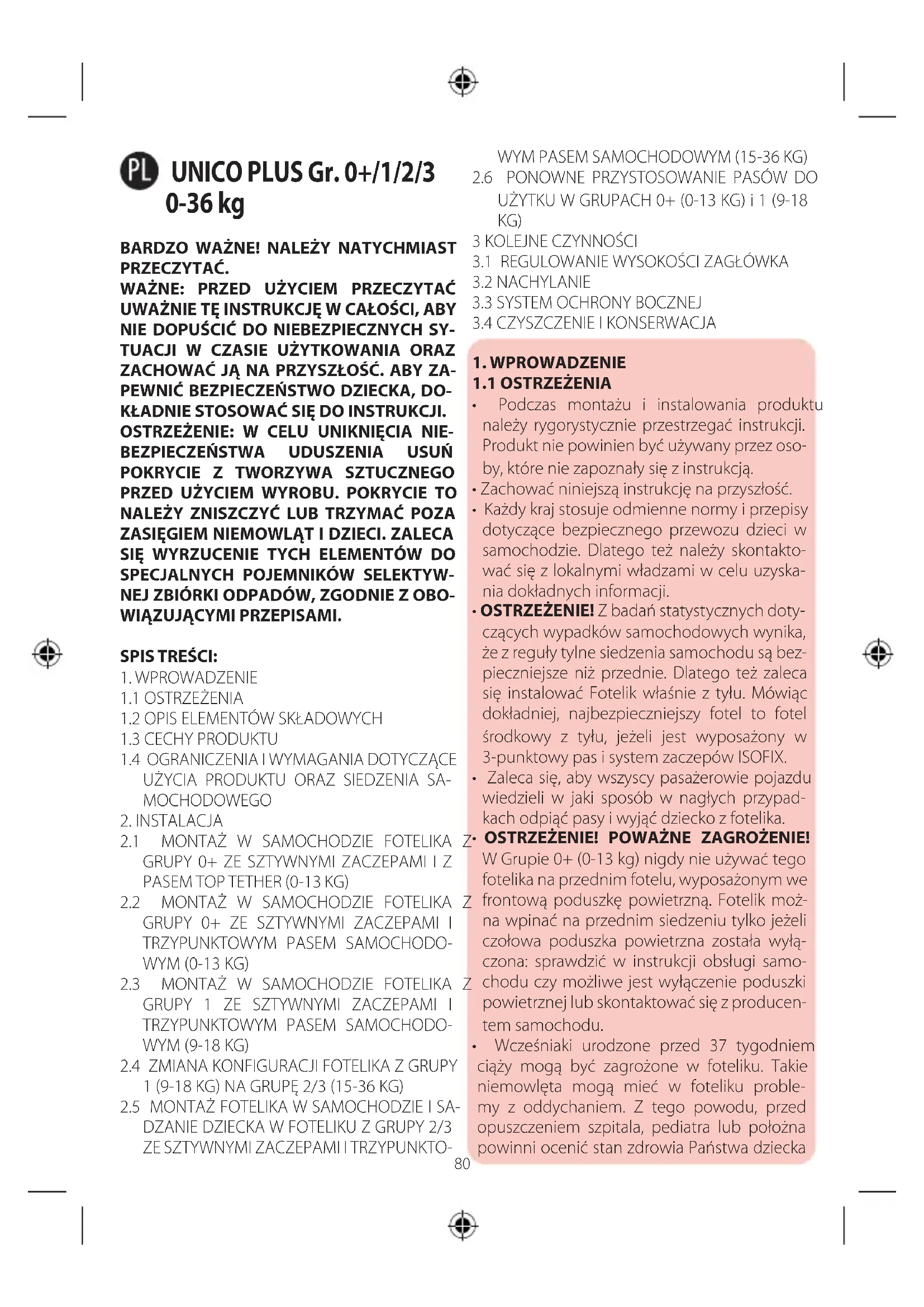 CZĄCE UŻYCIA PRODUKTU ORAZ SIE- DZENIA SAMOCHODOWEGO OSTRZEŻENIE! Należy dokładnie przestrze- gać poniższych ograniczeń i wymagań do- tyczących użycia produktu oraz siedzenia sa- mochodowego: w przeciwnym wypadku nie gwarantuje się bezpieczeństwa.