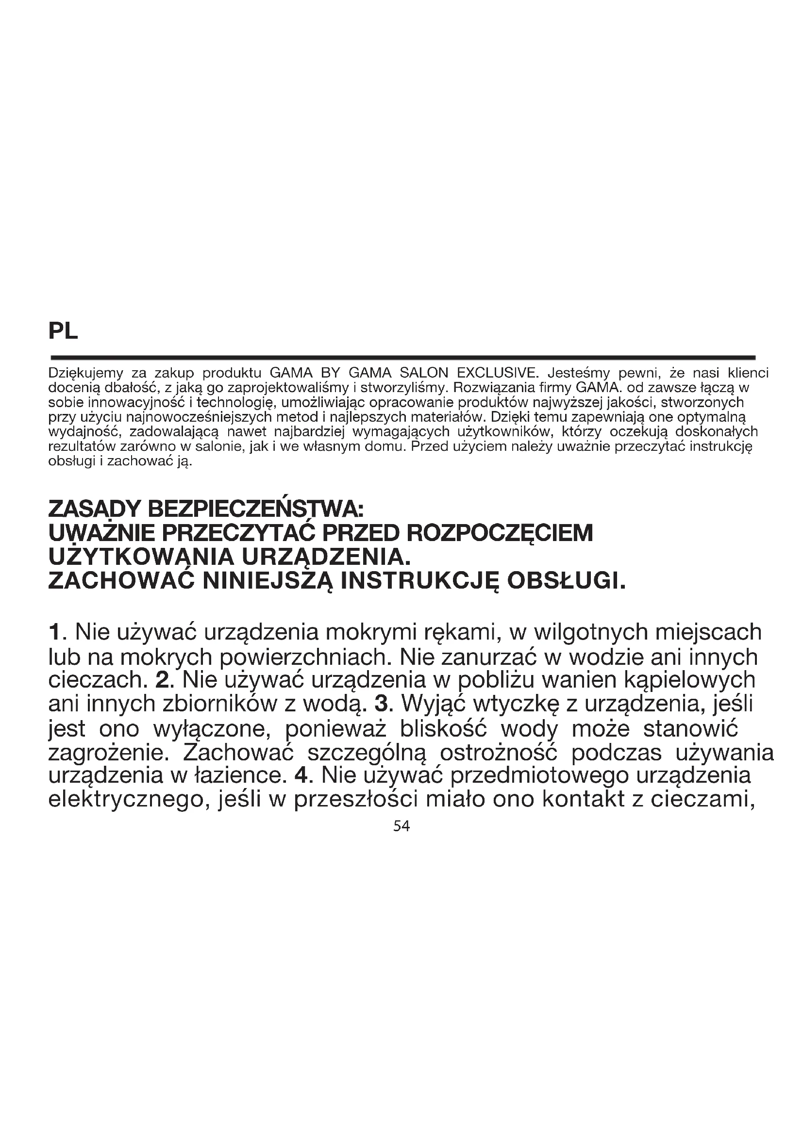 22PL Dziękujemy za zakup produktu GAMA BY GAMA SALON EXCLUSIVE. Jesteśmy pewni, że nasi klienci docenią dbałość, z jaką go zaprojektowaliśmy i stworzyliśmy. Rozwiązania firmy GAMA. od zawsze łączą w sobie innowacyjność i technologię, umożliwiając opracowanie produktów najwyższej jakości, stworzonych przy użyciu najnowocześniejszych metod i najlepszych materiałów. Dzięki temu zapewniają one optymalną wydajność, zadowalającą nawet najbardziej wymagających użytkowników, którzy oczekują doskonałych rezultatów zarówno w salonie, jak i we własnym domu. Przed użyciem należy uważnie przeczytać instrukcję obsługi i zachować ją. ZASADY BEZPIECZEŃSTWA: