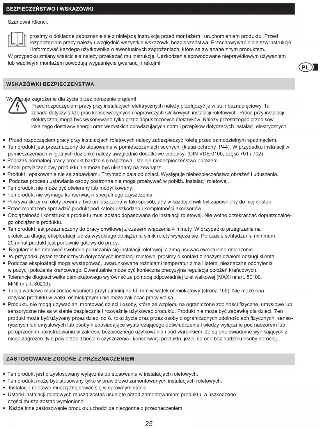 Występuje zagrożenie dla życia przez porażenie prądem! Przed rozpoczęciem pracy przy instalacjach elektrycznych należy przełączyć je w stan beznapięciowy. Ta zasada dotyczy także prac konserwacyjnych i naprawczych silnikowych instalacji roletowych. Prace przy instalacji elektrycznej mogą być wykonywane tylko przez dopuszczonych elektryków. Należy przestrzegać przepisów lokalnego dostawcy energii oraz wszystkich obowiązujących norm i przepisów dotyczących instalacji elektrycznych. Przed rozpoczęciem pracy przy instalacjach roletowych należy zabezpieczyć roletę przed samodzielnym spadnięciem. Ten produkt jest przeznaczony do stosowania w pomieszczeniach suchych. (klasa ochrony IP44). W przypadku instalacji w pomieszczeniach wilgotnych (łazienki) należy uwzględnić dodatkowe przepisy. (DIN VDE 0100, część 701 i 702) Podczas normalnej pracy produkt bardzo się nagrzewa. Istnieje niebezpieczeństwo obrażeń! Kabel przyłączeniowy produktu nie może być układany na zewnątrz. Produkt i opakowanie nie są zabawkami. Trzymać z dala od dzieci. Występuje niebezpieczeństwo obrażeń i uduszenia. Podczas procesu ustawiania osoby postronne nie mogą przebywać w pobliżu instalacji roletowej. Ten produkt nie może być otwierany lub modykowany. Ten produkt nie wymaga konserwacji i specjalnego czyszczenia. Pokrywa skrzynki rolety powinna być umieszczona w taki sposób, aby w każdej chwili był zapewniony do niej dostęp. Przed montażem sprawdzić produkt pod kątem uszkodzeń i kompletności akcesoriów. Obciążalność i konstrukcja produktu musi zostać dopasowana do instalacji roletowej. Nie wolno przekraczać dopuszczalne- go obciążenia produktu. Ten produkt jest przeznaczony do pracy chwilowej z czasem włączenia 4 minuty. W przypadku przegrzania na skutek za długiej eksploatacji lub za wysokiego obciążenia silnik rolety wyłącza się. Po czasie schładzania minimum 20 minut produkt jest ponownie gotowy do pracy. Regularnie kontrolować swobodę poruszania się instalacji roletowej, a zimą usuwać ewentualne oblodzenie. W przypadku pytań technicznych dotyczących instalacji roletowej prosimy o kontakt z naszym działem obsługi klienta. Podczas eksploatacji mogą występować, uwarunkowane różnicami temperatur zimą i latem, nieznaczne odchylenia w pozycji położenia krańcowego. Ewentualnie może być konieczna precyzyjna regulacja położeń krańcowych. Tolerancje długości wałka ośmiokątowego wyrównać za pomocą odpowiedniej tulei wałkowej (MAXI nr art. 80100, MINI nr art. 80200). Tuleja wałkowa musi zostać wsunięta przynajmniej na 60 mm w wałek ośmiokątowy (strona 155). Nie może ona dotykać produktu w wałku ośmiokątnym i nie może zakłócać pracy wałka. Produktu nie mogą używać ani montować dzieci i osoby, które ze względu na ograniczone zdolności zyczne, umysłowe lub sensoryczne nie są w stanie bezpiecznie i rozważnie użytkować produktu. Produkt nie może być zabawką dla dzieci. Ten produkt może być używany przez dzieci od 8. roku życia oraz przez osoby o ograniczonych zdolnościach zycznych, senso- rycznych lub umysłowych lub osoby nieposiadające wystarczającego doświadczenia i wiedzy wyłącznie pod nadzorem lub po uprzednim poinstruowaniu w zakresie bezpiecznego użytkowania i pod warunkiem, że są one świadome wynikających z niego zagrożeń. Nie powierzać dzieciom czyszczenia i konserwacji produktu, jeżeli są one bez nadzoru osoby dorosłej.