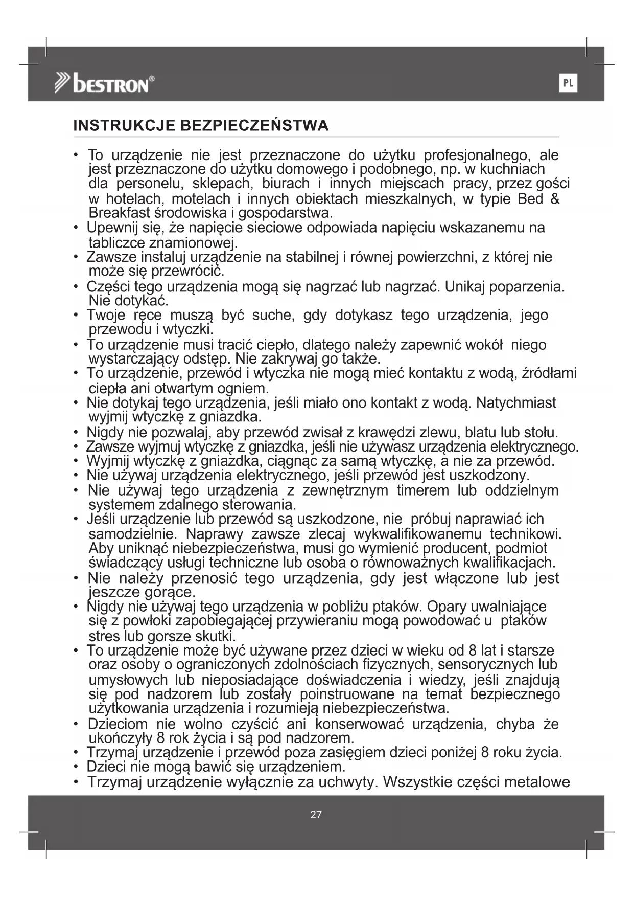 - Trzymaj urządzenie i przewód poza zasięgiem dzieci poniżej 8 roku życia.