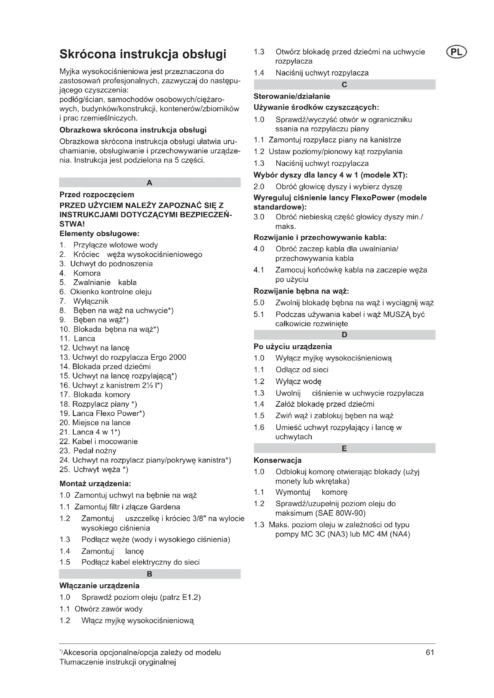 Skrócona instrukcja obsługi Myjka wysokociśnieniowa jest przeznaczona do zastosowań profesjonalnych, zazwyczaj do następu- jącego czyszczenia: podłóg/ścian, samochodów osobowych/ciężaro- wych, budynków/konstrukcji, kontenerów/zbiorników i prac rzemieślniczych. Obrazkowa skrócona instrukcja obsługi Obrazkowa skrócona instrukcja obsługi ułatwia uru- chamianie, obsługiwanie i przechowywanie urządze- nia. Instrukcja jest podzielona na 5 części.