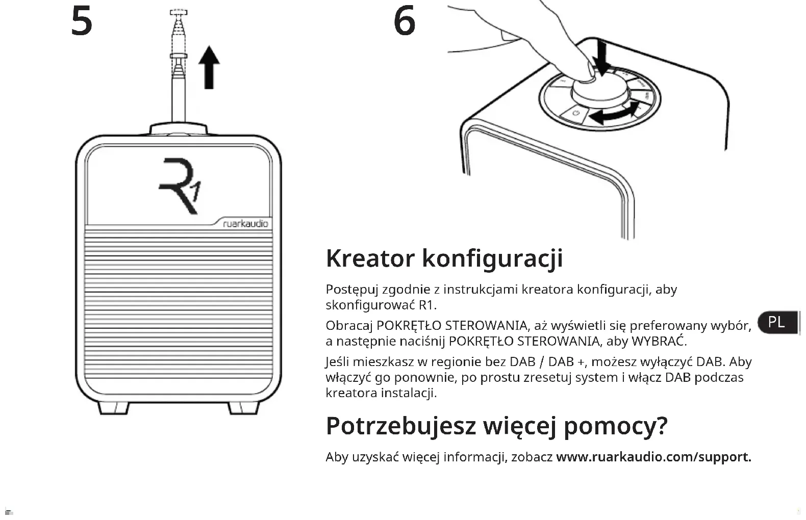 Kreator konguracji Postępuj zgodnie z instrukcjami kreatora konguracji, aby skongurować R1. Obracaj POKRĘTŁO STEROWANIA, aż wyświetli się preferowany wybór, a następnie naciśnij POKRĘTŁO STEROWANIA, aby WYBRAĆ. Jeśli mieszkasz w regionie bez DAB / DAB +, możesz wyłączyć DAB. Aby włączyć go ponownie, po prostu zresetuj system i włącz DAB podczas kreatora instalacji. Potrzebujesz więcej pomocy? Aby uzyskać więcej informacji, zobacz www.ruarkaudio.com/support. 6Sterownica