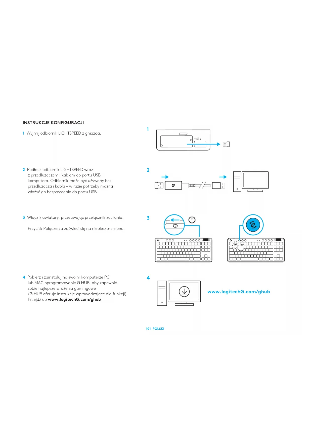 .101 POLSKI INSTRUKCJE KONFIGURACJI 1 Wyjmij odbiornik LIGHTSPEED z gniazda. 2 Podłącz odbiornik LIGHTSPEED wraz zprzedłużaczem i kablem do portu USB komputera. Odbiornik może być używany bez przedłużacza i kabla – w razie potrzeby można włożyć go bezpośrednio do portu USB. 3 Włącz klawiaturę, przesuwając przełącznik zasilania. Przycisk Połączenia zaświeci się na niebiesko-zielono. 4 Pobierz i zainstaluj na swoim komputerze PC lubMAC oprogramowanie G HUB, abyzapewnić sobie najlepsze wrażenia gamingowe (G HUB oferuje instrukcje wprowadzające dlafunkcji). Przejdź do www.logitechG.com/ghub