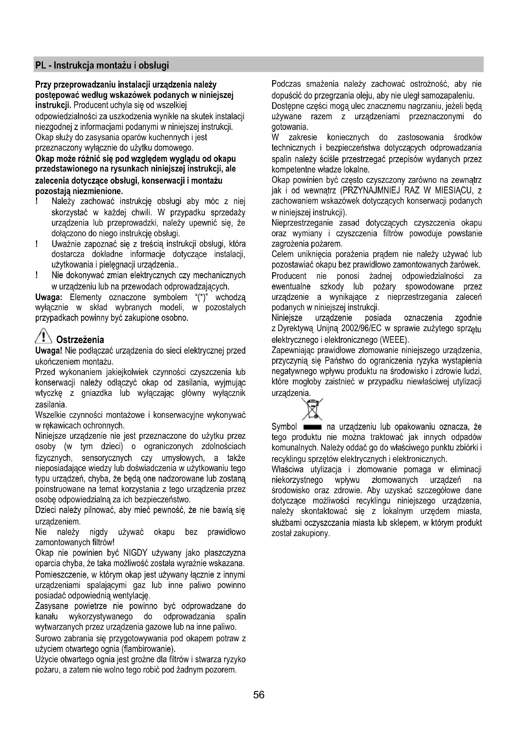 Tryk på tasten i 3 sekunder; emhættens betjeningselektronik afbrydes. Denne funktion kan være nyttig under rengøring af emhætten. Tryk på tasten for at tilslutte elektronikken igen. Hvis der opstår fejlfunktion, bør man - inden henvendelse til servicetjenesten - afbryde emhætten fra elforsyningen i mindst 5 sekunder ved at trække stikket ud, og derefter tilslutte emhætten igen. Hvis fejlfunktionen fortsætter, bedes man kontakte servicetjenesten. Vedligeholdelse Obs! Inden der udføres nogen form for rengøring eller vedligeholdelse skal emhætten afbrydes fra elnettet ved at fjerne stikket fra stikkontakten, eller ved at afbryde hjemmets hovedafbryder. Rengøring Emhætten skal rengøres jævnligt både på ydersiden og på indersiden (mindst med samme frekvens som for vedligeholdelse af fedtfiltrene). Ved rengøring skal man anvende en klud fugtet med neutrale, milde rengøringsmidler i flydende form. Undgå brug af produkter indeholdende slibemidler BENYT ALDRIG SPRIT! Pas på: Manglende overholdelse af vejledningen til rengøring af apparatet og udskiftning af filtrene medfører brandfare. Der henstilles således til, at instruktionerne følges. Fabrikanten frasiger sig ethvert ansvar for eventuel beskadigelse af motoren, brande forårsaget af utilstrækkelig vedligeholdelse af apparatet eller manglende overholdelse af ovenstående instruktioner. Fedtfilter - Fig. 19-25 Tilbageholder de fedtpartikler, der dannes under tilberedning af mad. Fedtfilteret skal rengøres med milde vaskemidler en gang om måneden (eller når signaleringssystemet for filtermætning angiver behovet – hvis denne funktion findes på den købte model); filteret kan også vaskes i opvaskemaskine ved lave temperaturer og med en kort opvaskecyklus. Ved vask i opvaskemaskinen kan metal-fedtfilteret blive misfarvet, men dette vil ikke have negativ indflydelse på dets filtrerende egenskaber. Træk i fjederhåndtaget for at afmontere fedtfilteret. Kulfilter (kun den filtrerende udgave) - Fig. 23 Filteret opfanger lugt fra madlavning. Kulfilteret kan vaskes hver anden måned (eller når systemet til angivelse af filtermætning – hvis det er monteret på den købte model – viser, at der er behov) i varmt vand og egnet vaskemiddel, eller i opvaskemaskine ved 65°C (vask i opvaskemaskinen skal ske med en fuld cyklus uden andre køkkengenstande). Fjern det overskydende vand uden at ødelægge filteret; læg derefter filteret i ovnen i 10 minutter ved 100°C for at tørre det helt. Udskift den lille madras hver 3. år, og når kluden er beskadiget. Udskiftning af lyspærerne Emhætten er udstyret med et belysningssystem baseret på lysdiode-teknologi. Lysdioderne sikrer optimal belysning, holdbarhed op til 10 gange længere end almindelige pærer, og de giver mulighed for at spare 90% elektricitet. Ved udskiftning bedes man kontakte den tekniske servicetjeneste.56 PL - Instrukcja montażu i obsługi Przy przeprowadzaniu instalacji urządzenia należy postępować według wskazówek podanych w niniejszej instrukcji. Producent uchyla się od wszelkiej odpowiedzialności za uszkodzenia wynikłe na skutek instalacji niezgodnej z informacjami podanymi w niniejszej instrukcji. Okap służy do zasysania oparów kuchennych i jest przeznaczony wyłącznie do użytku domowego. Okap może różnić się pod względem wyglądu od okapu przedstawionego na rysunkach niniejszej instrukcji, ale zalecenia dotyczące obsługi, konserwacji i montażu pozostają niezmienione. ! Należy zachować instrukcję obsługi aby móc z niej skorzystać w każdej chwili. W przypadku sprzedaży urządzenia lub przeprowadzki, należy upewnić się, że dołączono do niego instrukcję obsługi. ! Uważnie zapoznać się z treś cią instrukcji obsługi, która dostarcza dokładne informacje dotyczące instalacji, użytkowania i pielęgnacji urządzenia.. ! Nie dokonywać zmian elektrycznych czy mechanicznych w urządzeniu lub na przewodach odprowadzających. Uwaga: Elementy oznaczone symbolem “(*)” wchodzą wyłącznie w skład wybranych modeli, w pozostałych przypadkach powinny być zakupione osobno. Ostrzeżenia Uwaga! Nie podłączać urządzenia do sieci elektrycznej przed ukończeniem montażu. Przed wykonaniem jakiejkolwiek czynności czyszczenia lub konserwacji należy odłączyć okap od zasilania, wyjmując wtyczkę z gniazdka lub wyłączając główny wyłącznik zasilania. Wszelkie czynności montażowe i konserwacyjne wykonywać w rękawicach ochronnych. Niniejsze urządzenie nie jest przeznaczone do użytku przez osoby (w tym dzieci) o ograniczonych zdolnościach fizycznych, sensorycznych czy umysłowych, a także nieposiadające wiedzy lub doświadczenia w użytkowaniu tego typu urządzeń, chyba, że będą one nadzorowane lub zostaną poinstruowane na temat korzystania z tego urządzenia przez osobę odpowiedzialną za ich bezpieczeństwo. Dzieci należy pilnować, aby mieć pewność, że nie bawią się urządzeniem. Nie należy nigdy używać okapu bez prawidłowo zamontowanych filtrów! Okap nie powinien być NIGDY używany jako płaszczyzna oparcia chyba, że taka możliwość została wyraźnie wskazana. Pomieszczenie, w którym okap jest używany łącznie z innymi urządzeniami spalającymi gaz lub inne paliwo powinno posiadać odpowiednią wentylację. Zasysane powietrze nie powinno być odprowadzane do kanału wykorzystywanego do odprowadzania spalin wytwarzanych przez urządzenia gazowe lub na inne paliwo. Surowo zabrania się przygotowywania pod okapem potraw z użyciem otwartego ognia (flambirowanie). Użycie otwartego ognia jest groźne dla filtrów i stwarza ryzyko pożaru, a zatem nie wolno tego robić pod żadnym pozorem. Podczas smażenia należy zachować ostrożność, aby nie dopuścić do przegrzania oleju, aby nie uległ samozapaleniu. Dostępne części mog ą ulec znacznemu nagrzaniu, jeżeli będą używane razem z urządzeniami przeznaczonymi do gotowania. W zakresie koniecznych do zastoso