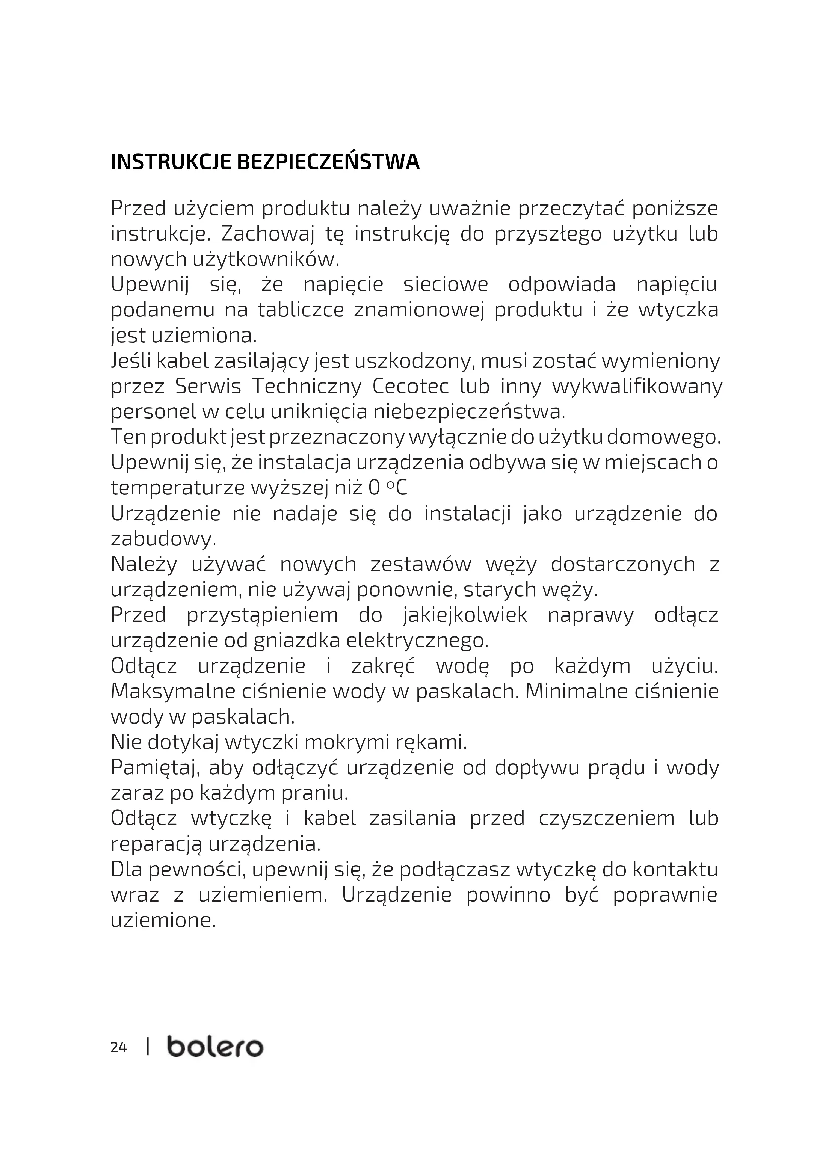 Przed użyciem produktu należy uważnie przeczytać poniższe instrukcje. Zachowaj tę instrukcję do przyszłego użytku lub nowych użytkowników. Upewnij się, że napięcie sieciowe odpowiada napięciu podanemu na tabliczce znamionowej produktu i że wtyczka jest uziemiona. Jeśli kabel zasilający jest uszkodzony, musi zostać wymieniony przez Serwis Techniczny Cecotec lub inny wykwalifikowany personel w celu uniknięcia niebezpieczeństwa. Ten produkt jest przeznaczony wyłącznie do użytku domowego. Upewnij się, że instalacja urządzenia odbywa się w miejscach o temperaturze wyższej niż 0 ºC Urządzenie nie nadaje się do instalacji jako urządzenie do zabudowy. Należy używać nowych zestawów węży dostarczonych z urządzeniem, nie używaj ponownie, starych węży. Przed przystąpieniem do jakiejkolwiek naprawy odłącz urządzenie od gniazdka elektrycznego. Odłącz urządzenie i zakręć wodę po każdym użyciu. Maksymalne ciśnienie wody w paskalach. Minimalne ciśnienie wody w paskalach. Nie dotykaj wtyczki mokrymi rękami. Pamiętaj, aby odłączyć urządzenie od dopływu prądu i wody zaraz po każdym praniu. Odłącz wtyczkę i kabel zasilania przed czyszczeniem lub reparacją urządzenia. Dla pewności, upewnij się, że podłączasz wtyczkę do kontaktu wraz z uziemieniem. Urządzenie powinno być poprawnie uziemione. IM 02317 02322 02327 02332 02319 02324 02328 02333 Lavadora Bolero DressCode_IC_YV_02210311.indd 24IM 02317 02322 02327 02332 02319 02324 02328 02333 Lavadora Bolero DressCode_IC_YV_02210311.indd 24 11/3/21 17:2411/3/21 17:2425 DRESSCODE 7200 / 8200 / 9200 / 10200 INVERTER